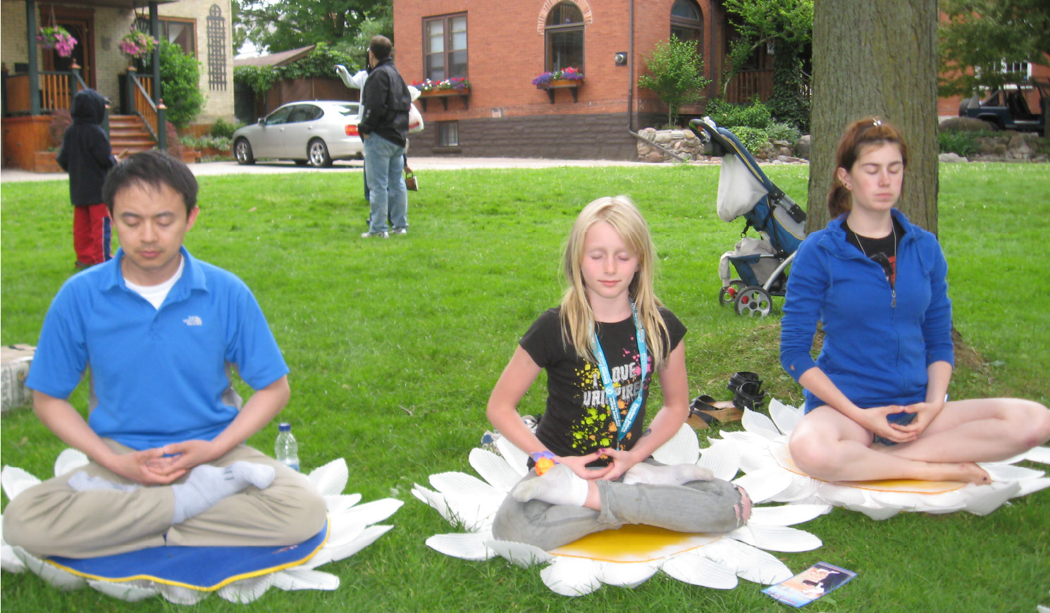 展位外的草地上,一群不同族裔的修炼人静坐莲台炼功,那安详与宁静令人恍如進入另外时空,游人不禁放缓脚步,或凝神观望功法演示,或静静阅读铺在草地上的法轮功展板,或跟着比划学炼,率真的孩子则干脆直接加入炼功的行列。