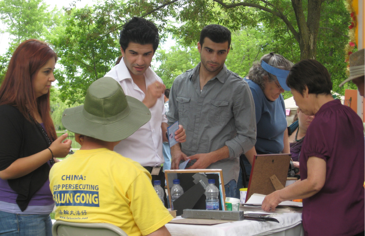 似为人们的热诚感染,天公也作美,原本低压的云层一直滴雨未降。前来索求书法和莲花的人络绎不绝,甚至排队等候。学员写书法,折莲花,演示功法,介绍法轮功,推荐神韵晚会,几乎无暇休息。直到晚间八点半,天色已晚,人们才渐渐散去。