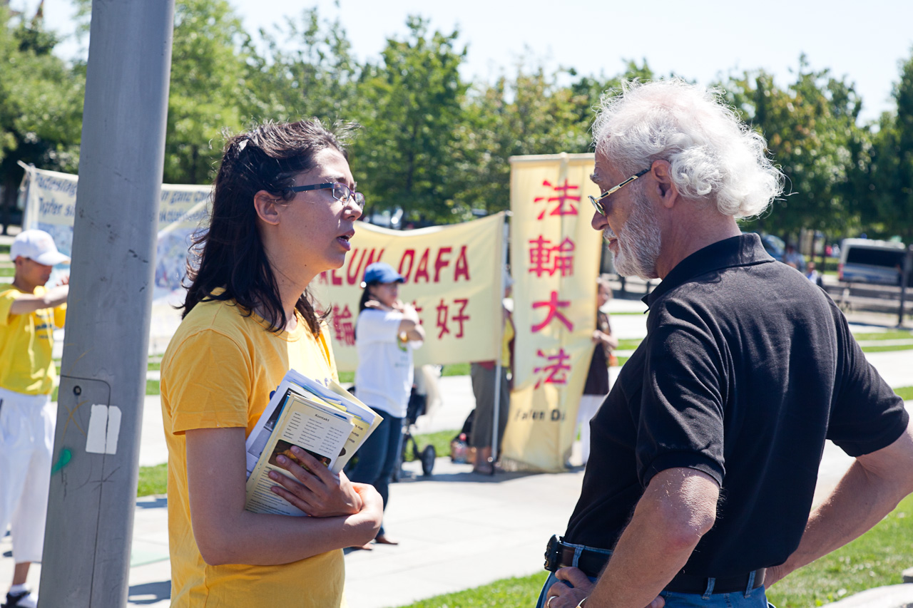 一位从以色列来的游客特地找到会说英文的法轮功学员,询问什么是法轮功,法轮功为什么被迫害。当她听说已经有几千名法轮功学员被中共迫害致死,并且直到现在还有成千上万的法轮功学员被关在劳教所和监狱里时,她表示,作为来自犹太国家以色列的人,她知道什么叫做迫害。最后她双手合十,为在中国受到迫害的法轮功学员祝福,并祝愿抗议的法轮功学员一切顺利。