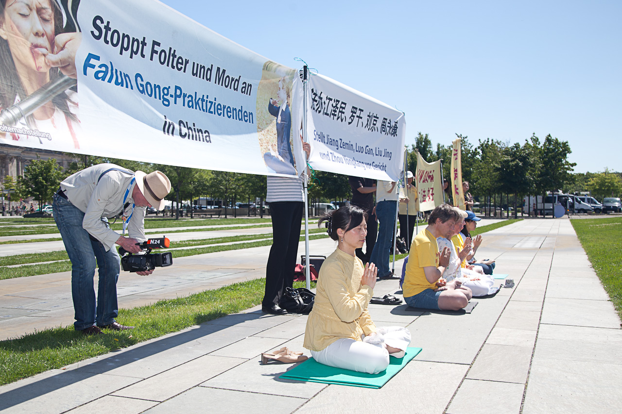 ![]() 法轮功学员在德国总理府前炼功,打横幅,抗议中共迫害法轮功 |