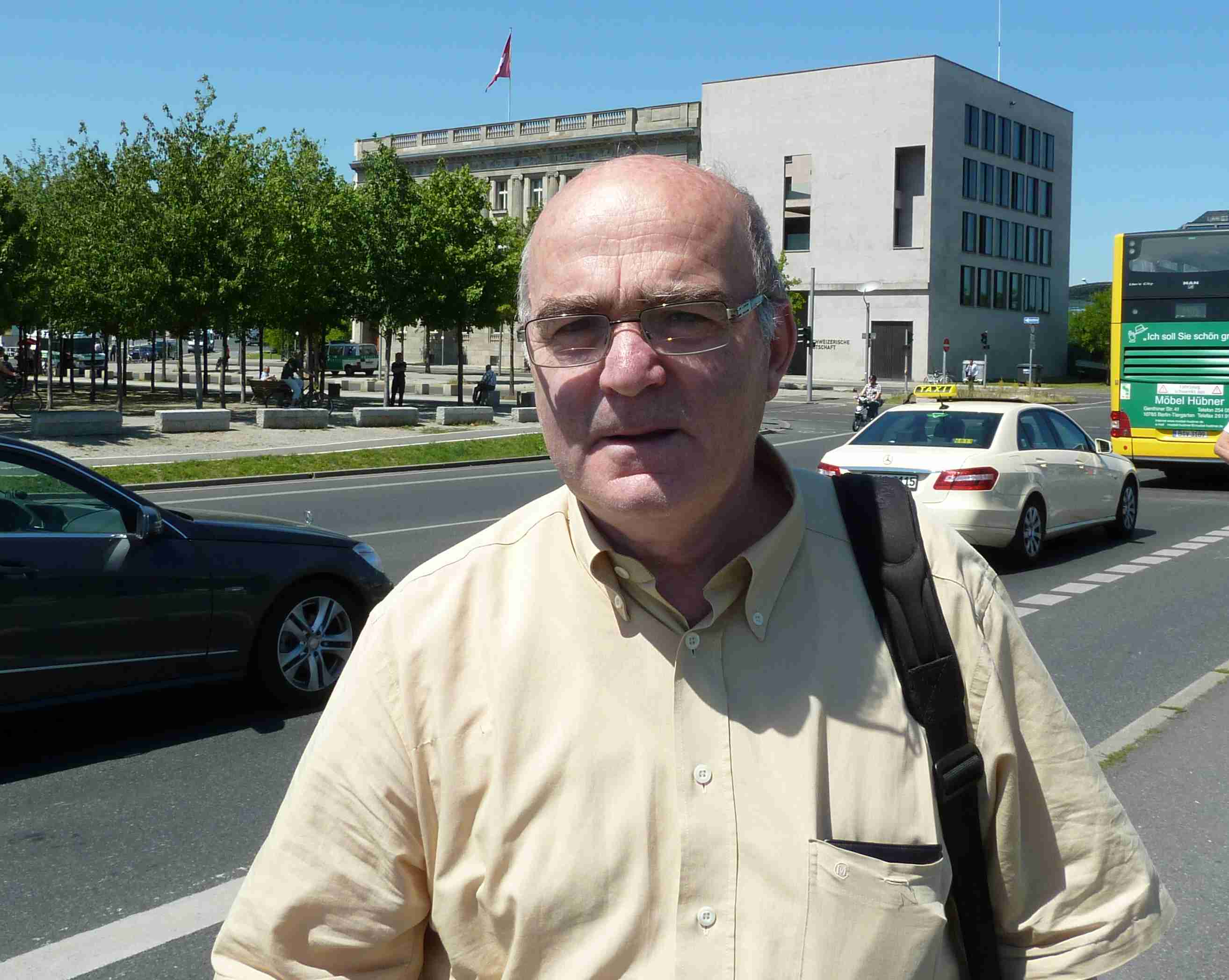 施率特(Wolfgang Schroter)的大半生是在前东德度过的,他的工作地点就在中共驻柏林大使馆旁边。已经有将近十年时间,法轮功学员每天都在中使馆前抗议,所以施率特也早就听说了法轮功被迫害的是事情。他说:“这是犯罪!是违反宪法的。”身为基督徒的施率特表示,前东德共产党也迫害宗教信仰人士,也不许人们抗议,共产党在哪里都要限制人们的自由。