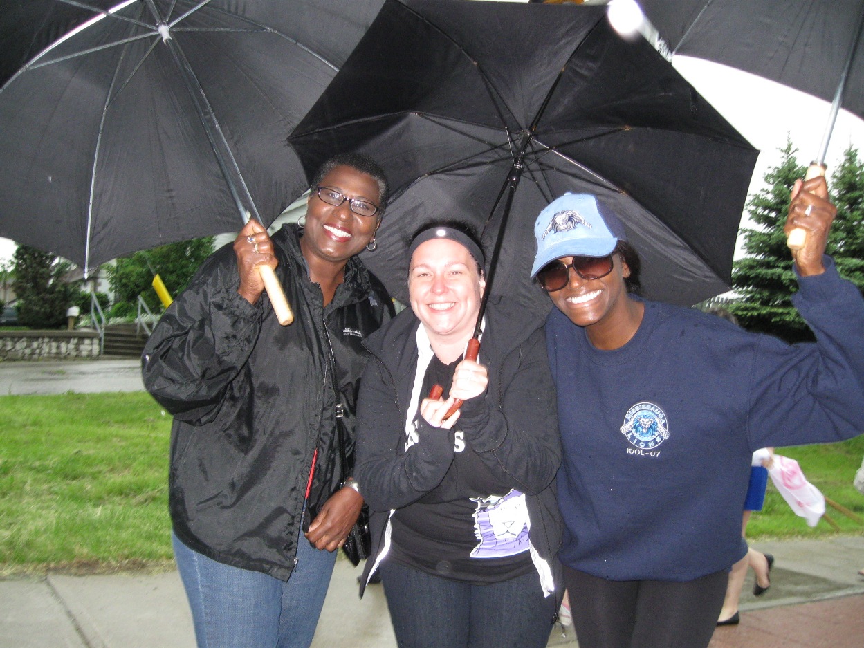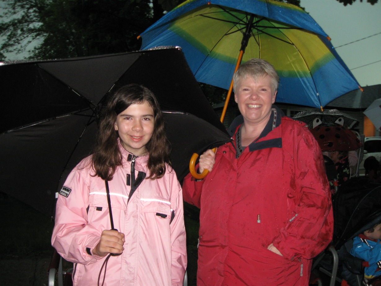![]() 莎朗(右)和朋友打着雨伞跟着天国乐团的音乐起舞 |