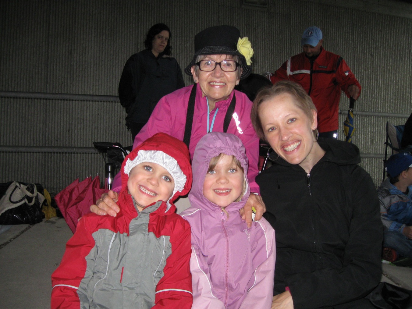 来自香港的王女士和她的韩国媳妇,带着一个两岁和一个不够一岁的孙女穿戴着雨具观看游行。王女士说:“真佩服他们(天国乐团),这么大的风雨,他们还个个的精神抖擞。谢谢他们!”