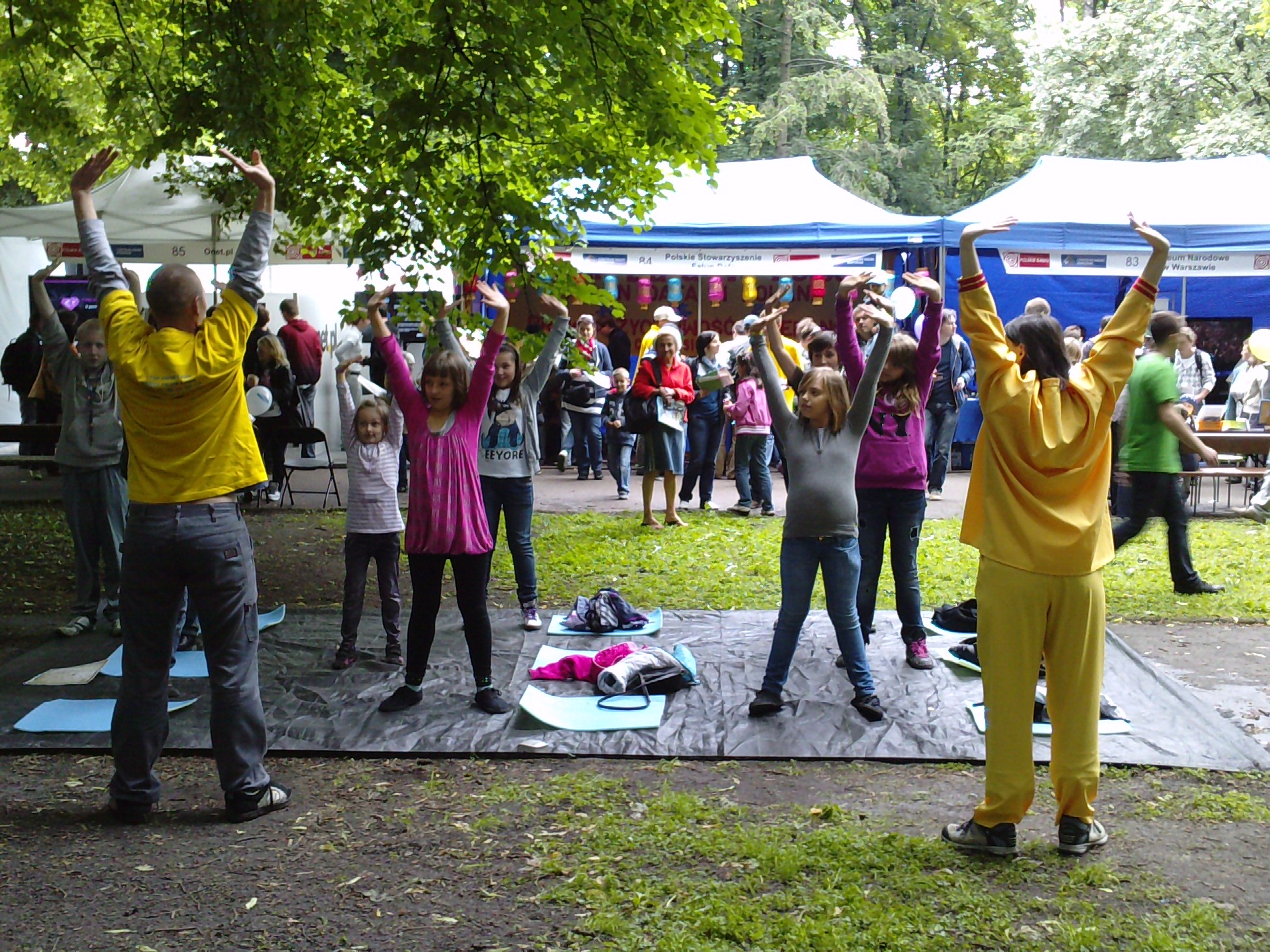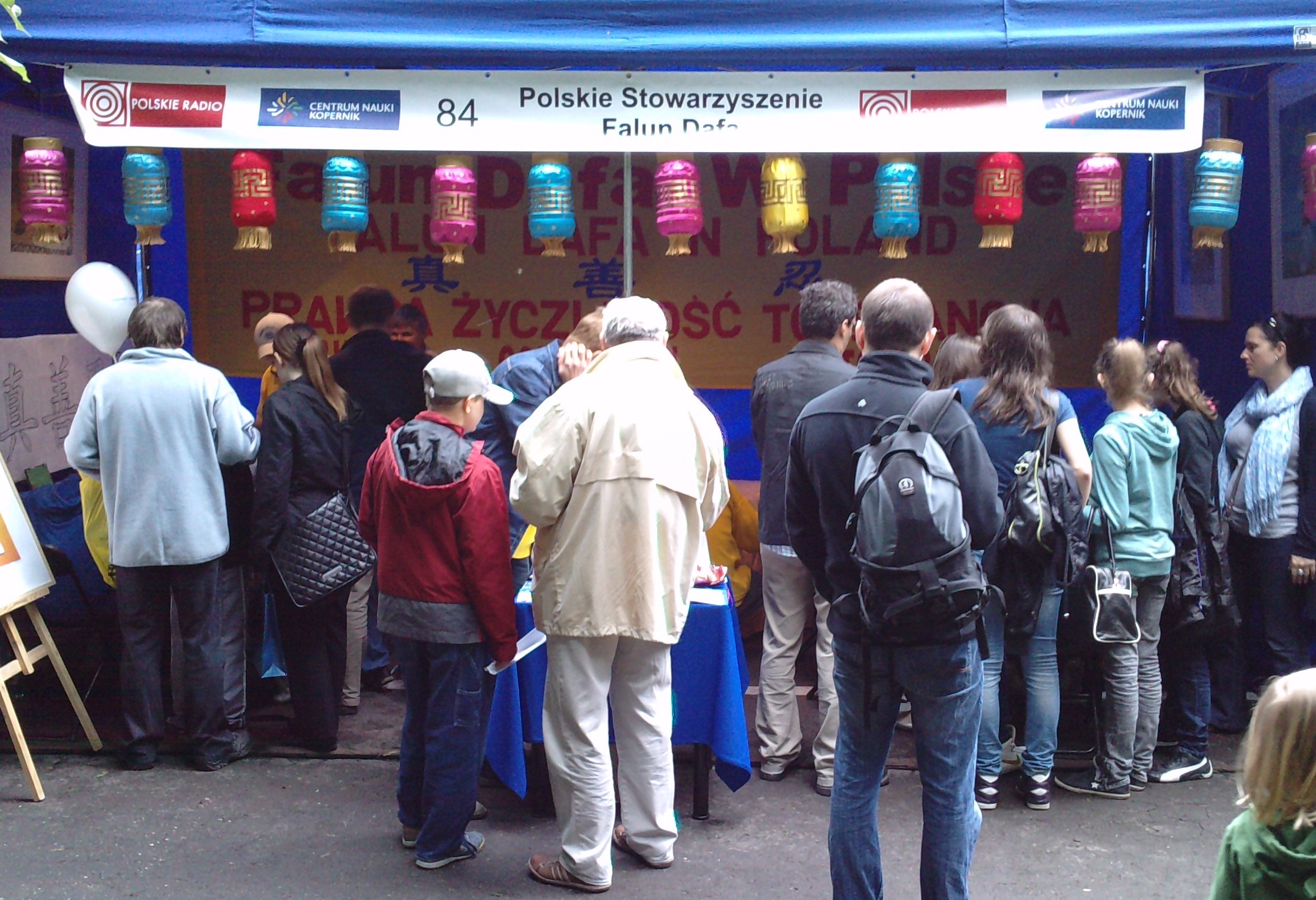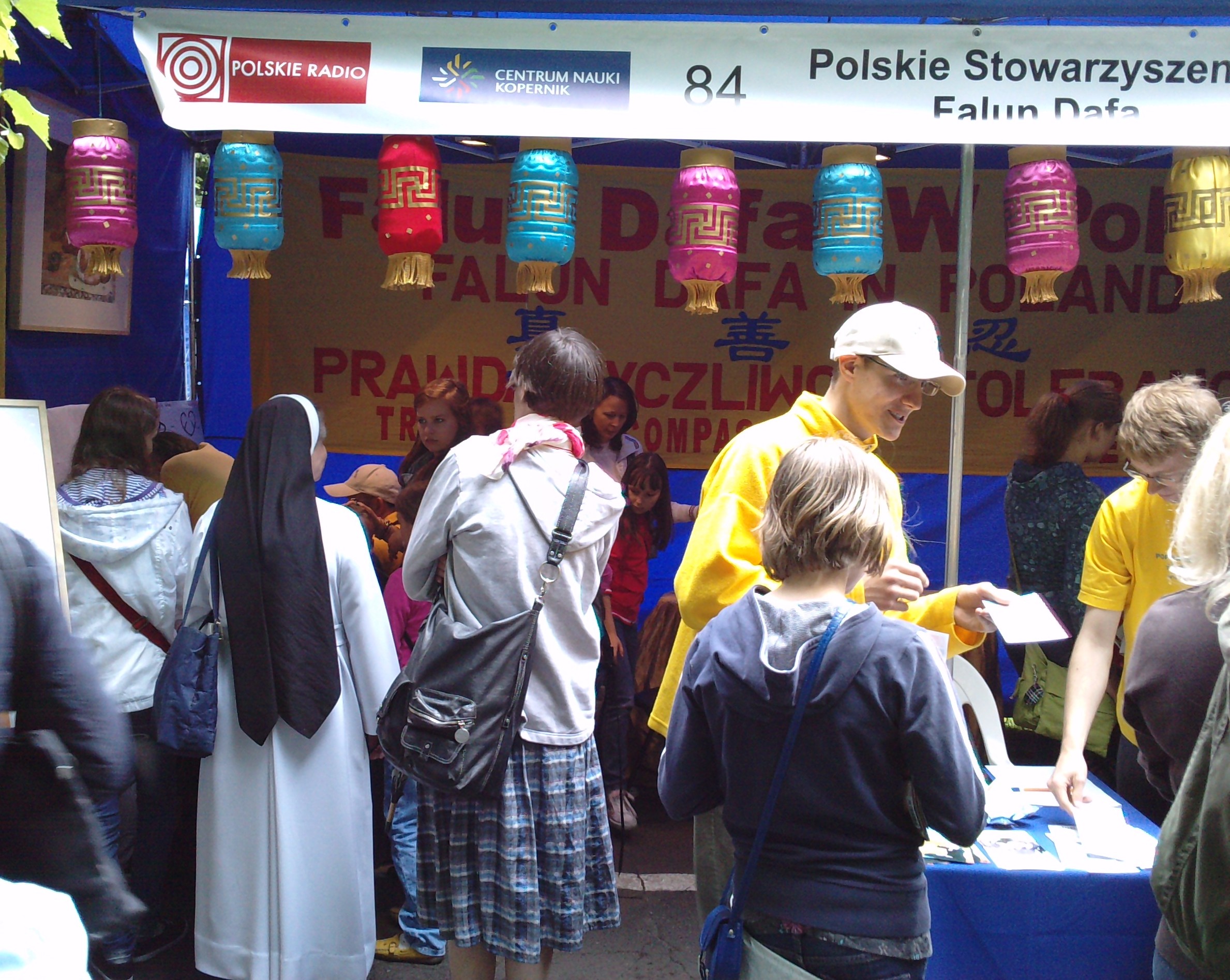 在琳琅满目变化无穷的众多展点中,人们发现有一处标有“法轮大法学会”的展点充满了东方的文化气息,蓝色的帐篷上挂着一排各色小灯笼,中波双语的“法轮大法在波兰”“真善忍”的大字横幅迎面而见,帐篷中一张桌子上放着很多写有“真善忍”的毛笔字帖,另一张桌子上放着各种颜色的彩纸、彩珠、彩线和几百朵以它们为材料制作的五彩缤纷的纸莲花,帐篷外一个展台上放满了法轮功真相资料,身着黄色T恤的人安静祥和地打坐,慈悲的音乐象一股清流沁入人们的身心。