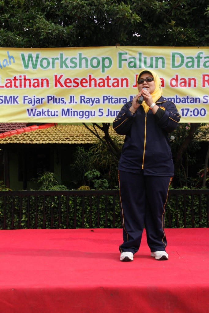 ![]() 茂物县人民协会议员艾娜瓦提女士为法轮大法介绍班主持了开幕式 |