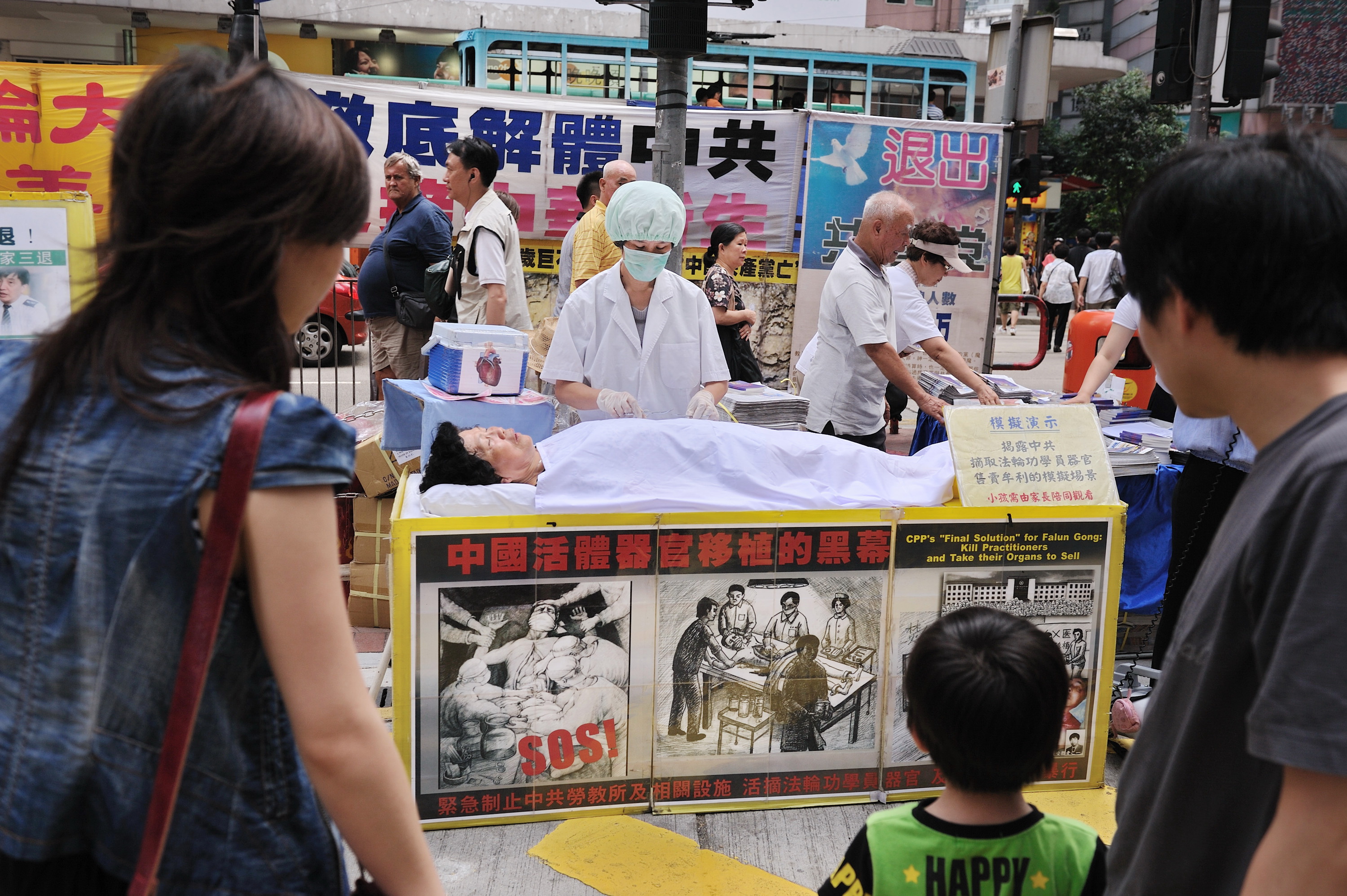 ![]() 香港维多利亚公园附近的真相点,揭露中共活摘法轮功学员器官的模拟表演 |