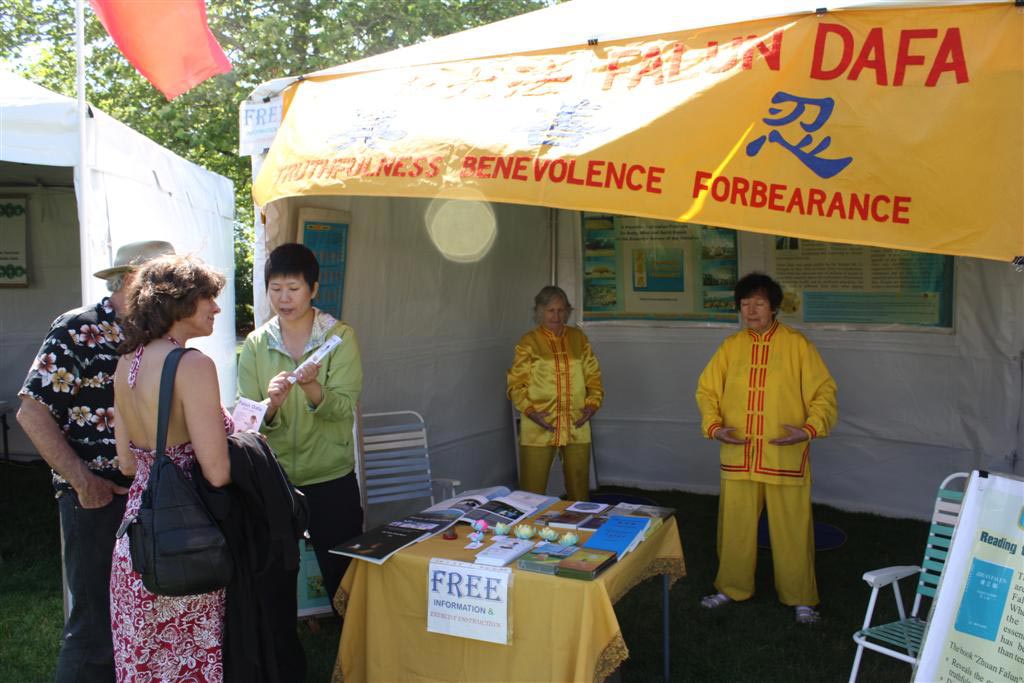 这两天天气晴朗,风和日丽,俄勒冈晚到的夏季给人们带来舒适、清爽的感觉。世界韵律节上游人如织。来到法轮功展位的人们络绎不绝,他们都对法轮功非常感兴趣。两天中,好几群人当场学习了功法,有的人在体验了打坐时的祥和之后久久不愿离去。很多人询问炼功点的详细情况,还有的社区工作人员表示要回去组织团体,请学员教功。