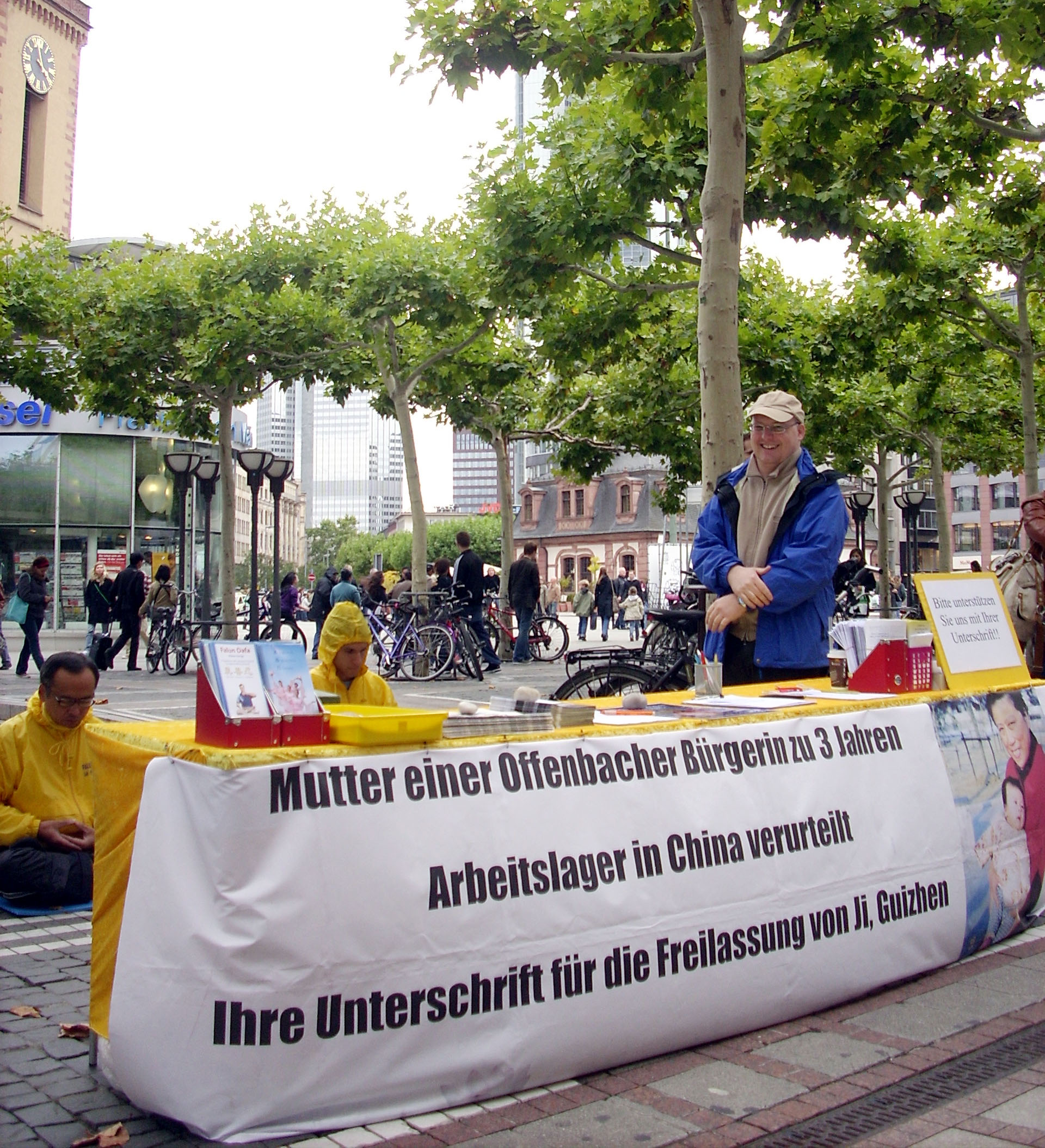 ![]() 多米尼克在位于法兰克福采尔街的法轮功信息台前 |