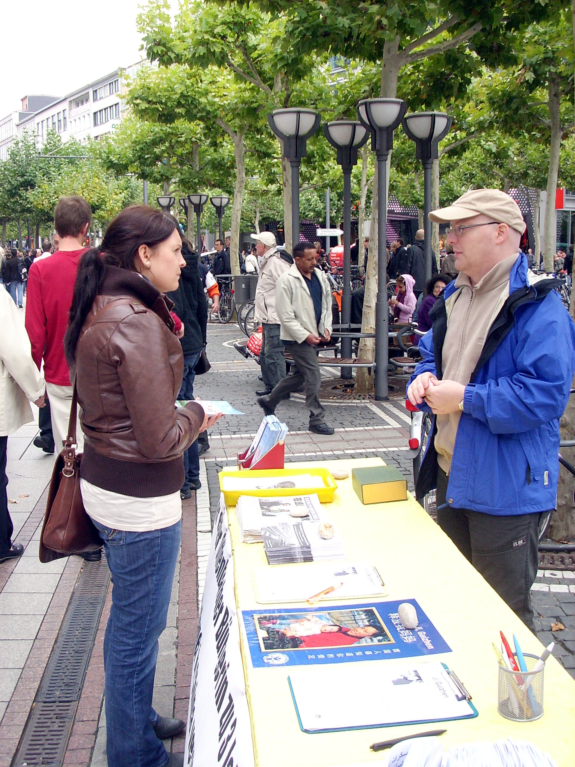 二零一零年秋天,法轮功学员把信息台移至法兰克福最大的购物街采尔街。作为欧洲商贸金融中心,法兰克福汇聚了众多来自各种社会阶层、各种文化背景的国际人士。