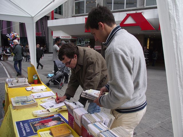 为了使更多民众,特别是更多中国游客了解真相,二零一零年秋,签名活动转到法兰克福市中心。一年下来,当地法轮功学员已经举办了四十二次信息日签名活动,征集到了一万多个签名。