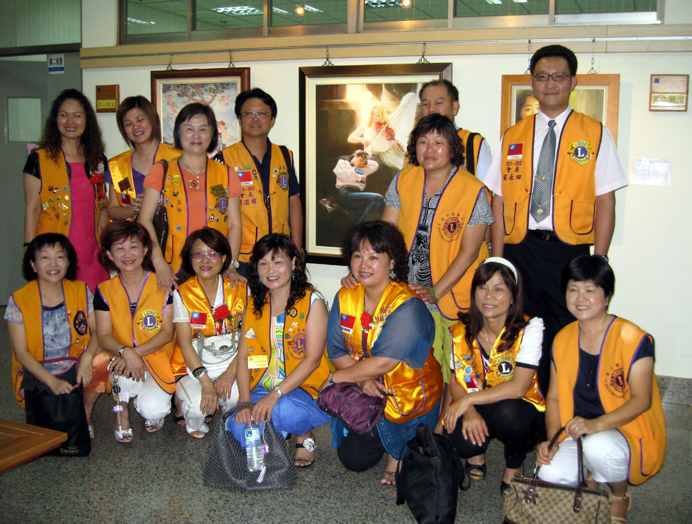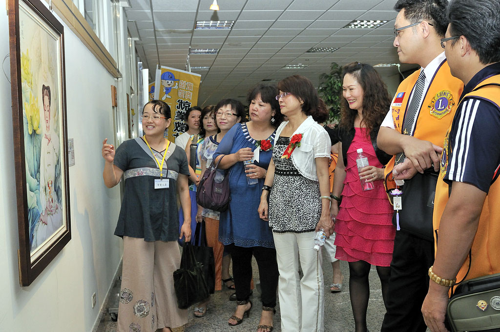 多位狮子会成员参观美展。后排左一为千禧狮子会会长庄艳春、右一为大峰狮子会会长宋永田。