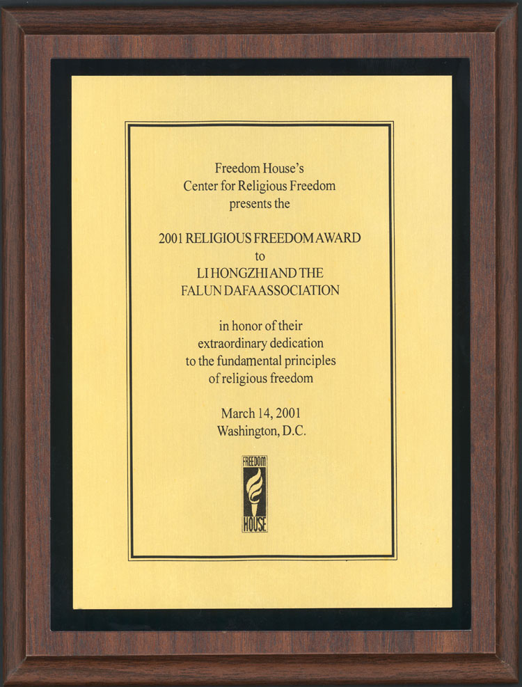 二零零一年三月十四日,美国历史最悠久的人权团体——“自由之家”(Freedom House)在美国参议院外交关系委员会听证大厅举行隆重的颁奖仪式,嘉奖在中国大陆受迫害而为争取信仰自由进行和平抗争的李洪志先生与法轮大法学会。美国之音及自由亚洲广播电台中文部向大陆听众用中文介绍此次颁奖仪式。主持会议的自由之家宗教自由中心负责人(布什总统政府的日内瓦人权代表团成员)妮娜•希尔女士(Nina Shea)、美国众议院中国工作小组主席南茜•普洛西议员(Congresswoman Nancy Pelosi)、美国参议院外交委员会主席杰西•海姆参议员(Jesse Helms)、美国国务院人权及民主事务助理国务卿麦克•帕米李(Michael Parmely)等都参与颁奖活动并发言致意。
