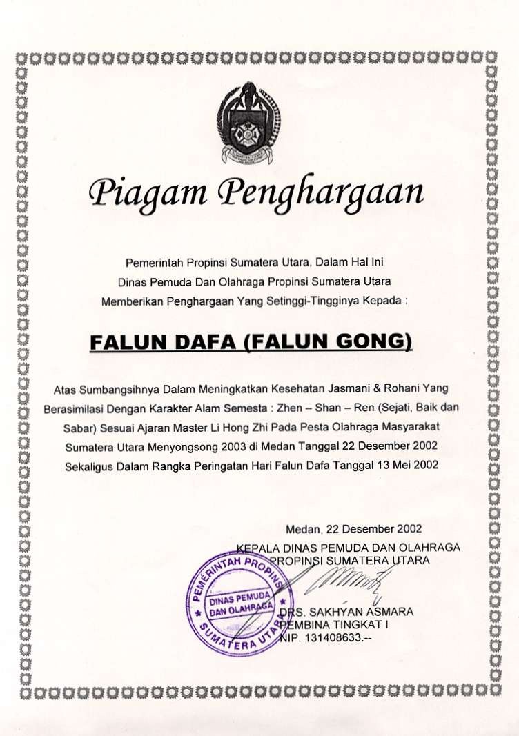 二零零二年十二月二十二日,印尼北苏门达腊(North Sumatra)法轮功学员受邀参加在Lapangan Merdeka举行的全国体育日活动。透过功法演示及介绍,法轮功在印尼人民,尤其是苏门达腊人民的心中留下了美好的形象。活动结束后,印尼北苏门达腊省青年和体育局授予法轮大法褒奖。