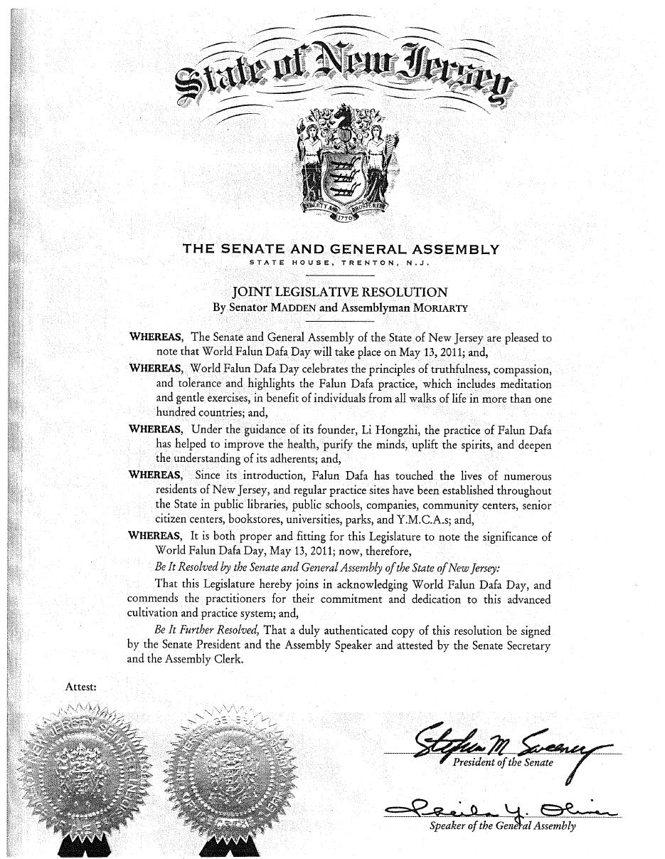 ![]() 二零一一年五月,美国新泽西州参众两院通过联合决议,表彰世界法轮大法日 |