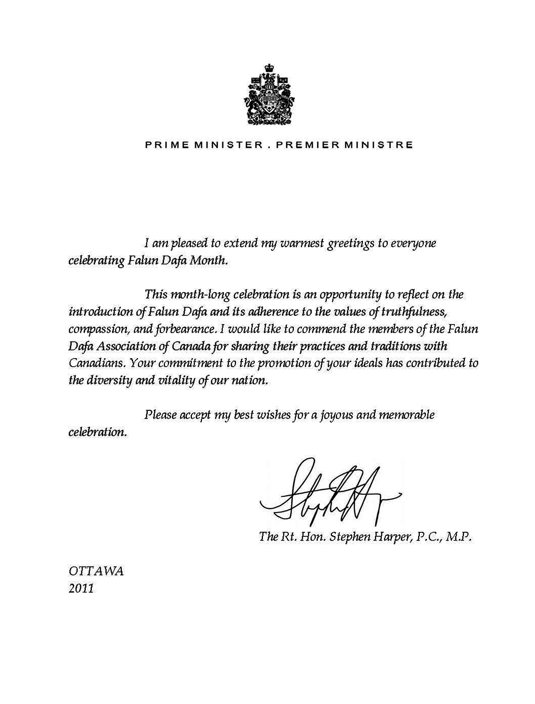 二零一一年五月,加拿大总理哈珀(Stephen Harper)给法轮大法学会发出贺信,赞扬法轮大法长期以来与加拿大社会分享“真、善、忍”理念。加拿大总理哈珀已经连续六年给法轮大法月发来贺信。哈珀表示,他很高兴向参加法轮大法月庆祝活动的每个人致以最诚挚的问候。