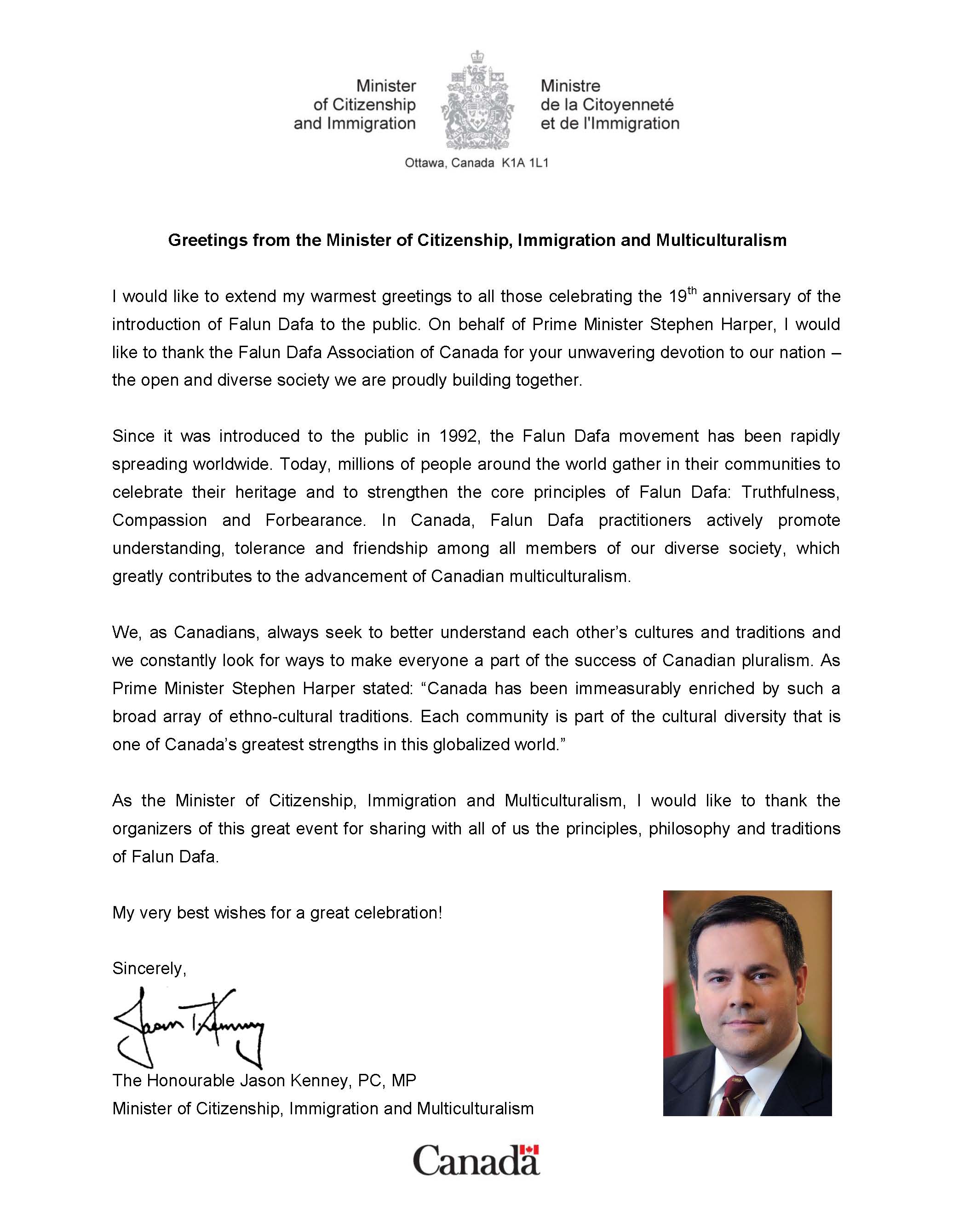 ![]() 加拿大公民、移民暨多元文化部长肯尼(Jason Kenney)在贺信中写道:“作为移民部长,我要感谢本次活动的组织者,让我们能有机会分享法轮大法的核心价值,理念和传统。” |