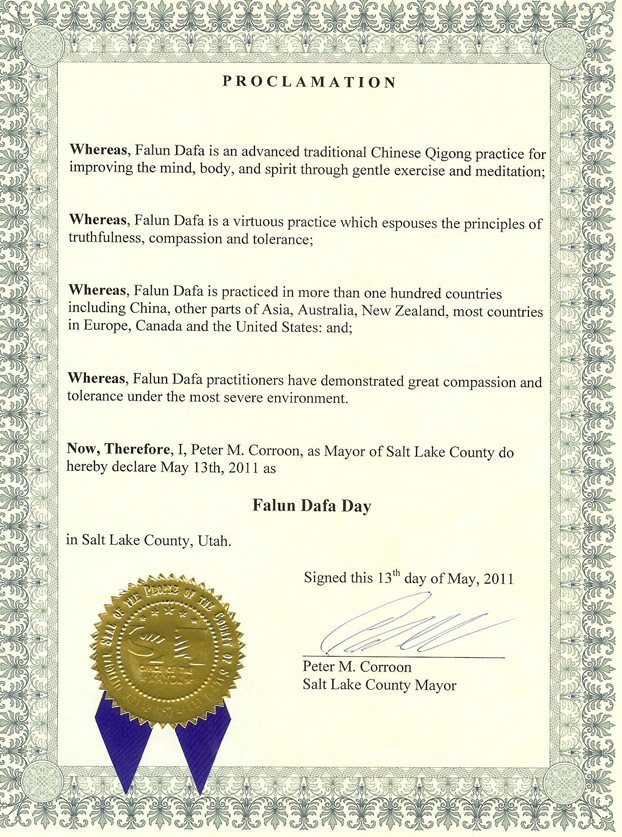 ![]() 美国犹他州盐湖郡郡长彼得•考荣(Peter M. Corroon)的褒奖状中推崇,“法轮大法是一项弘传中国,其他亚洲国家、澳洲、新西兰、大部份欧洲、加拿大及美国在内的一百多个国家的功法。” |
