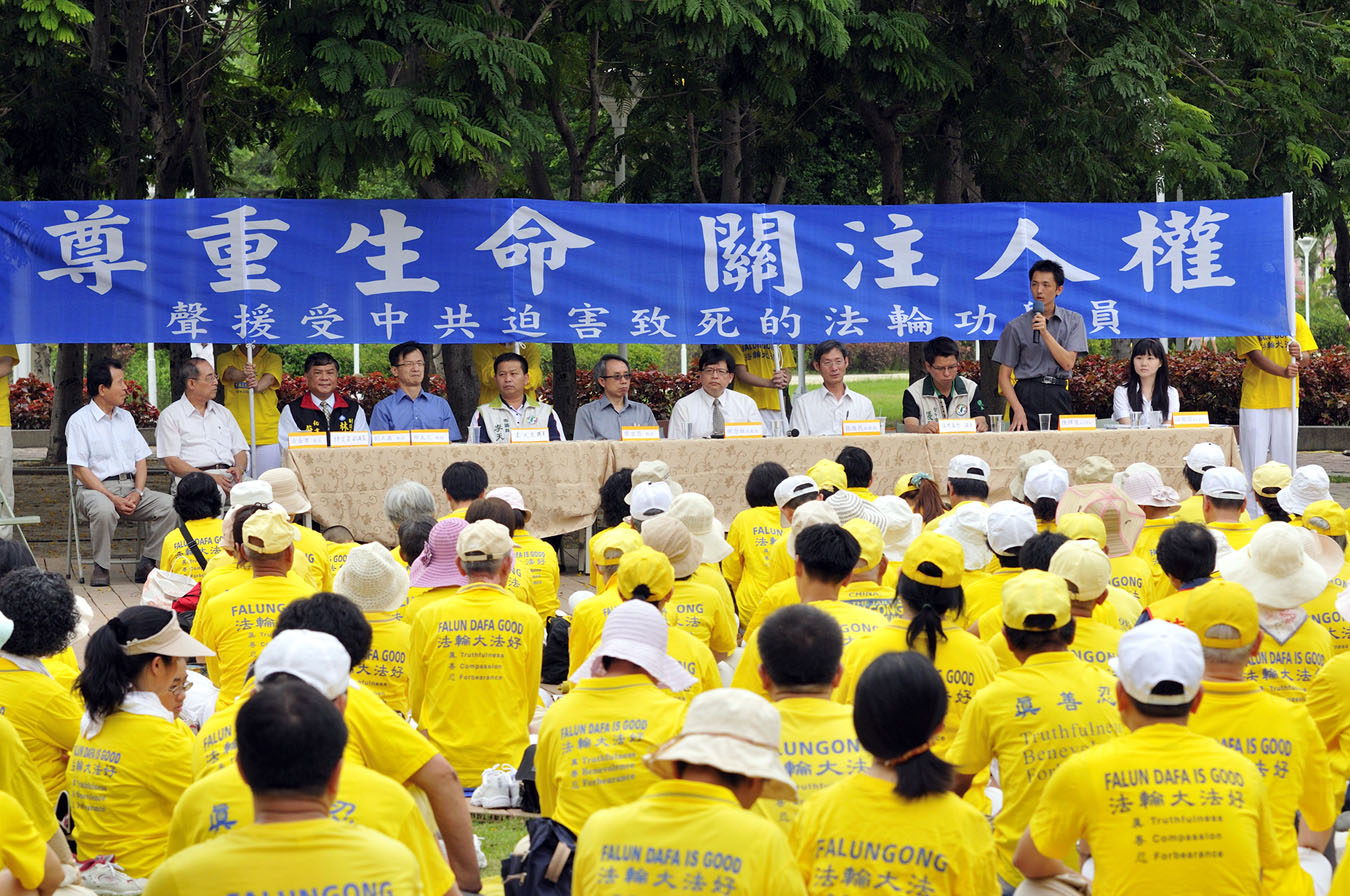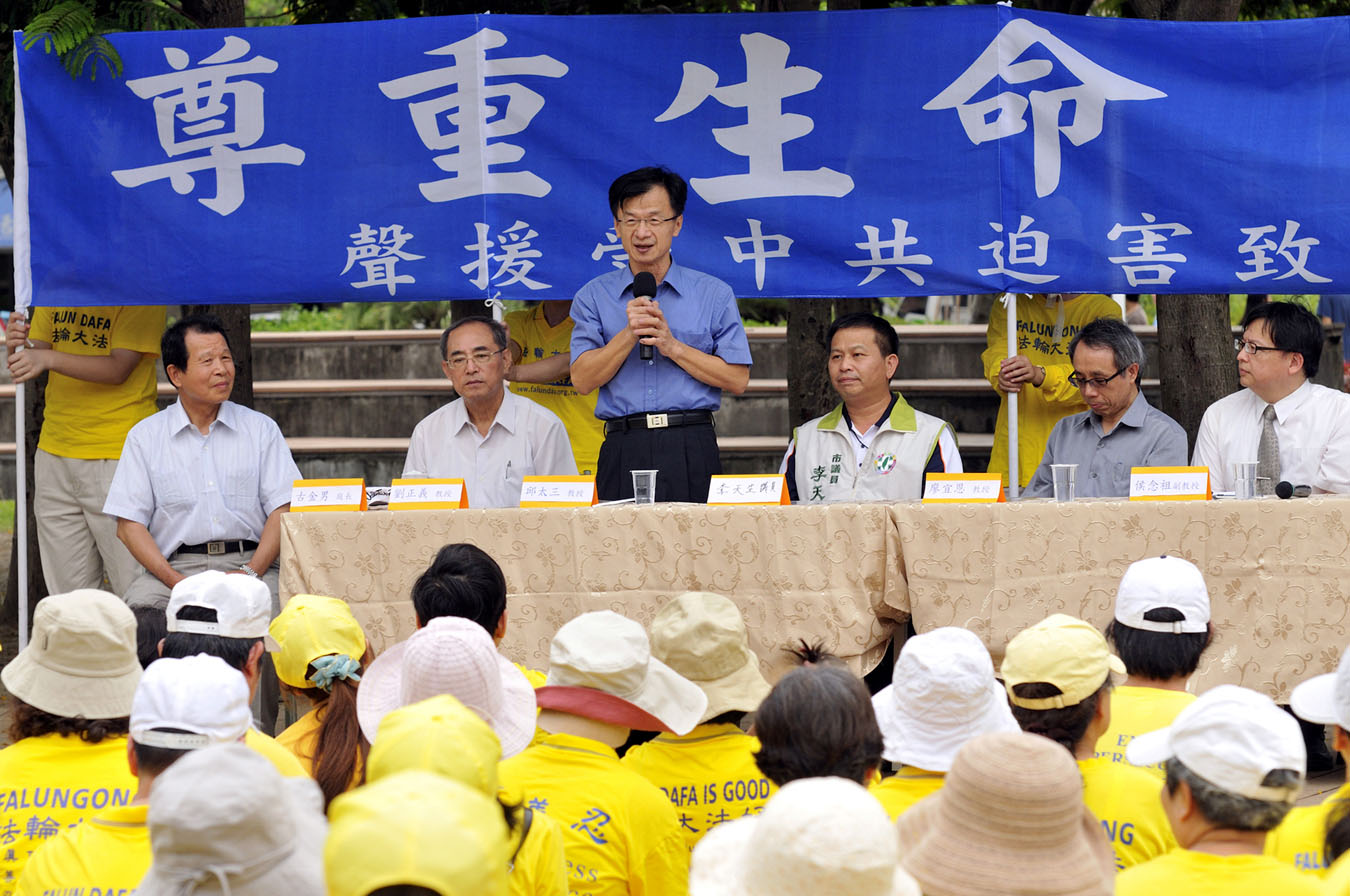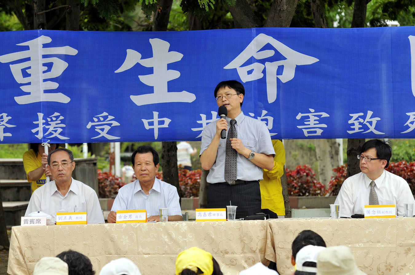 中兴大学教授廖宜恩在集会上提到了台湾争取民主自由的经验,他表示珍惜台湾民主自由的同时,也可以给全世界的华人、给大陆受迫害的法轮功学员信心。这个集会就是要让他们知道,在台湾有这么多人在用最大的力气支持他们,行使抵抗暴政的权利。他也感谢法轮功学员的付出。