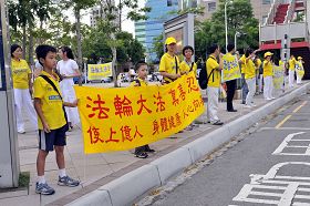 记者会后,学员沿着车流量非常大的文心路一、二段两侧排开,拉起“法轮大法好”、“制止迫害法轮功”等横幅,过往民众不论开车或骑车,纷纷转头注意学员的诉求,更有好多人热情地给他们鼓励。带着四个孩子来参加活动的谢女士说,一位骑车的男士经过她们面前,热情地朝她竖起大拇指,大声喊“加油!”另一位学员也提到,有路人在停下来等红绿灯时,对她喊完加油后,又往前向另一个学员喊加油,她感觉到民众非常支持法轮功。