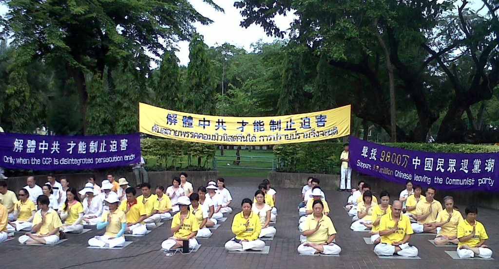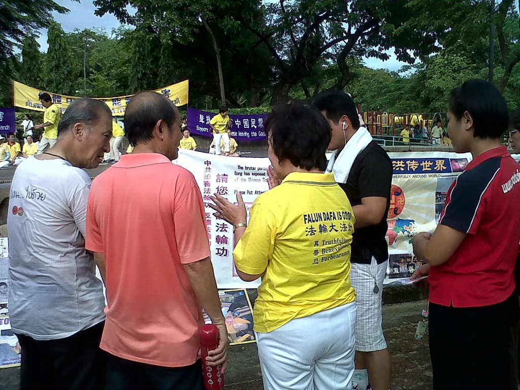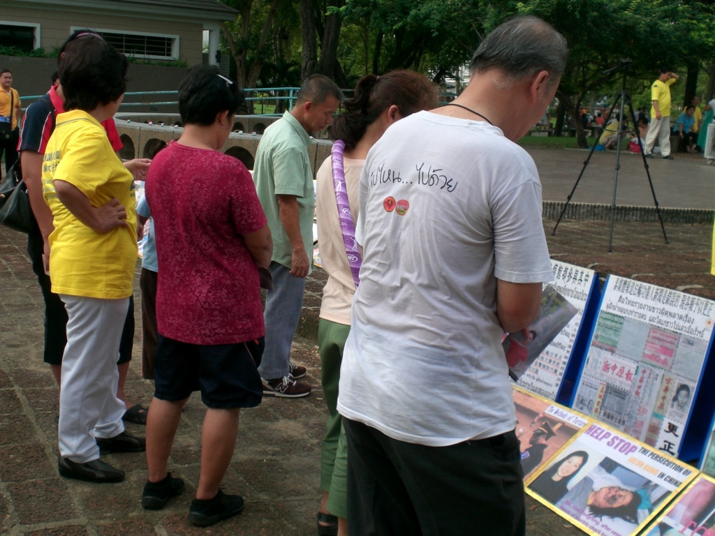集会于下午五点开始,法轮功学员在曼谷是乐园打出了“解体中共才能停止迫害”等横幅,摆放了真相展板,向人们揭露中共的暴行,传递着停止迫害的呼声。法轮功学员还在现场演示了五套功法,展现法轮大法的祥和美好。