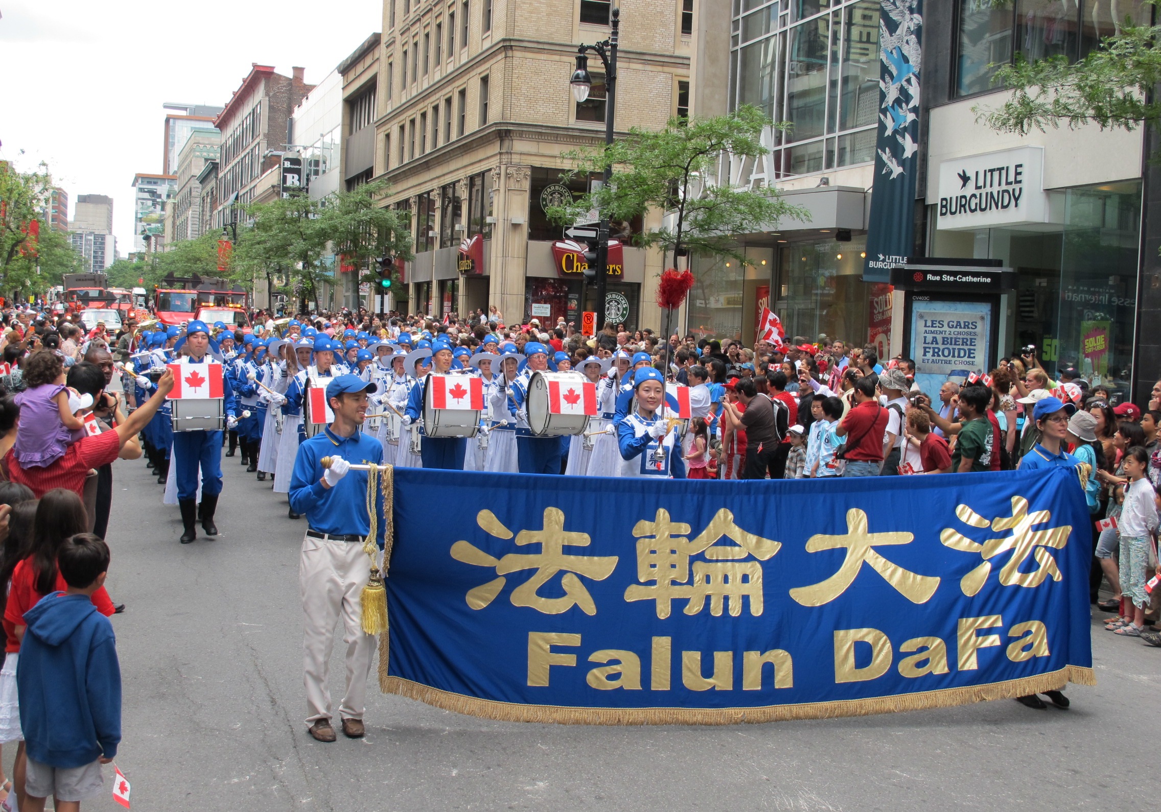 每年庆祝加拿大国庆的游行,是蒙特利尔大型群众性活动之一,由社会各界自愿发起和组织。自二零零零年以来,法轮功学员每年都参加这个游行,精美的彩车、优美的仙女及法轮功的功法演示给组织者和观众留下深刻的印象,逐渐成为一个主要的参加团体。自二零零六年加拿大法轮大法天国乐团成立以来,连续六年应邀参加蒙城国庆游行,并受到好评和褒奖。