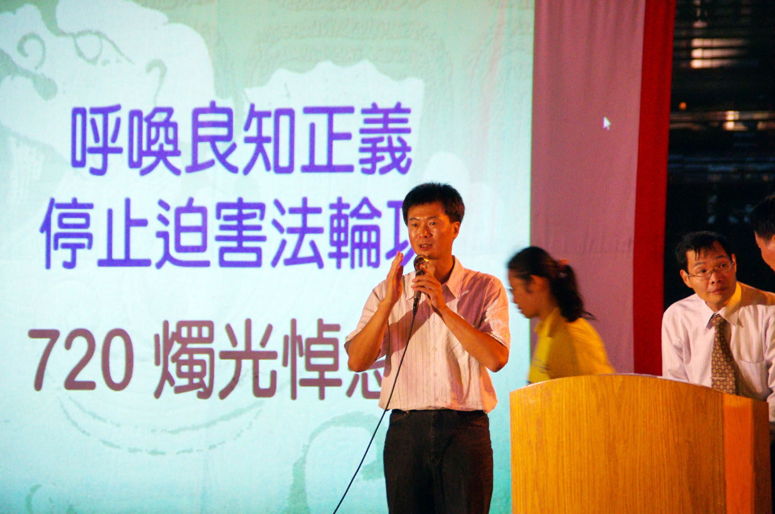 立法委员刘建国一到场立即走进圆环内与学员一起静坐悼念。他说,呼唤良知,制止迫害法轮功的活动,他绝对会坚持参与到底。一路走来,看到在各地法轮大法学员展现的意志,那种力量会无限无限地放大,总有一天“真、善、忍”一定会打败“假恶暴”,而自己也一定一路支持法轮功。