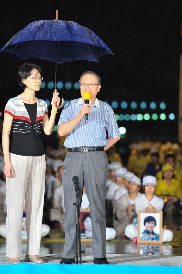 法轮功学员无畏滂沱大雨,持续进行烛光悼念会暨记者会,不分男女老幼无一离席,场面庄严肃穆,震撼人心。与会来宾皆十分感动,民视、三立电视公司及《自由时报》也来采访报道。