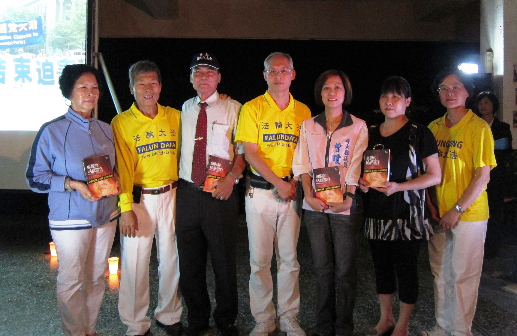![]() 前来声援的县议员曾琼慧(右三)、镇民代表郑金祈(左三)及在地贵宾等,接受法轮功学员赠送的《血腥的活摘器官》一书并与学员合影。 |