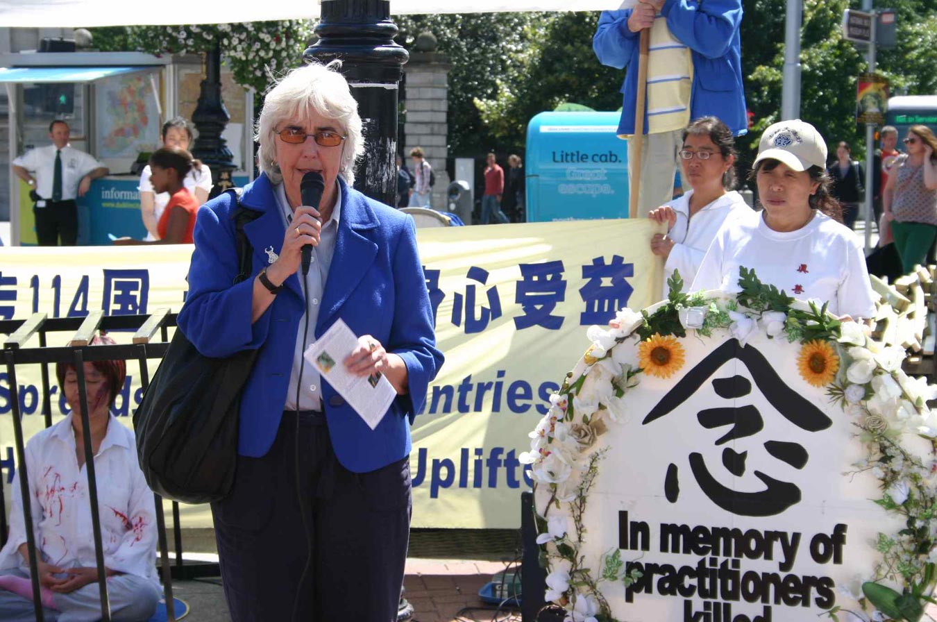 爱尔兰国会议员莫琳·奥沙利文发表了演讲,她说:“‘真善忍’是这个团体的指导原理,任何一个政权怎么能害怕这个呢?我认为这一点说明了中国人民所面对的是一个什么样的政府。”