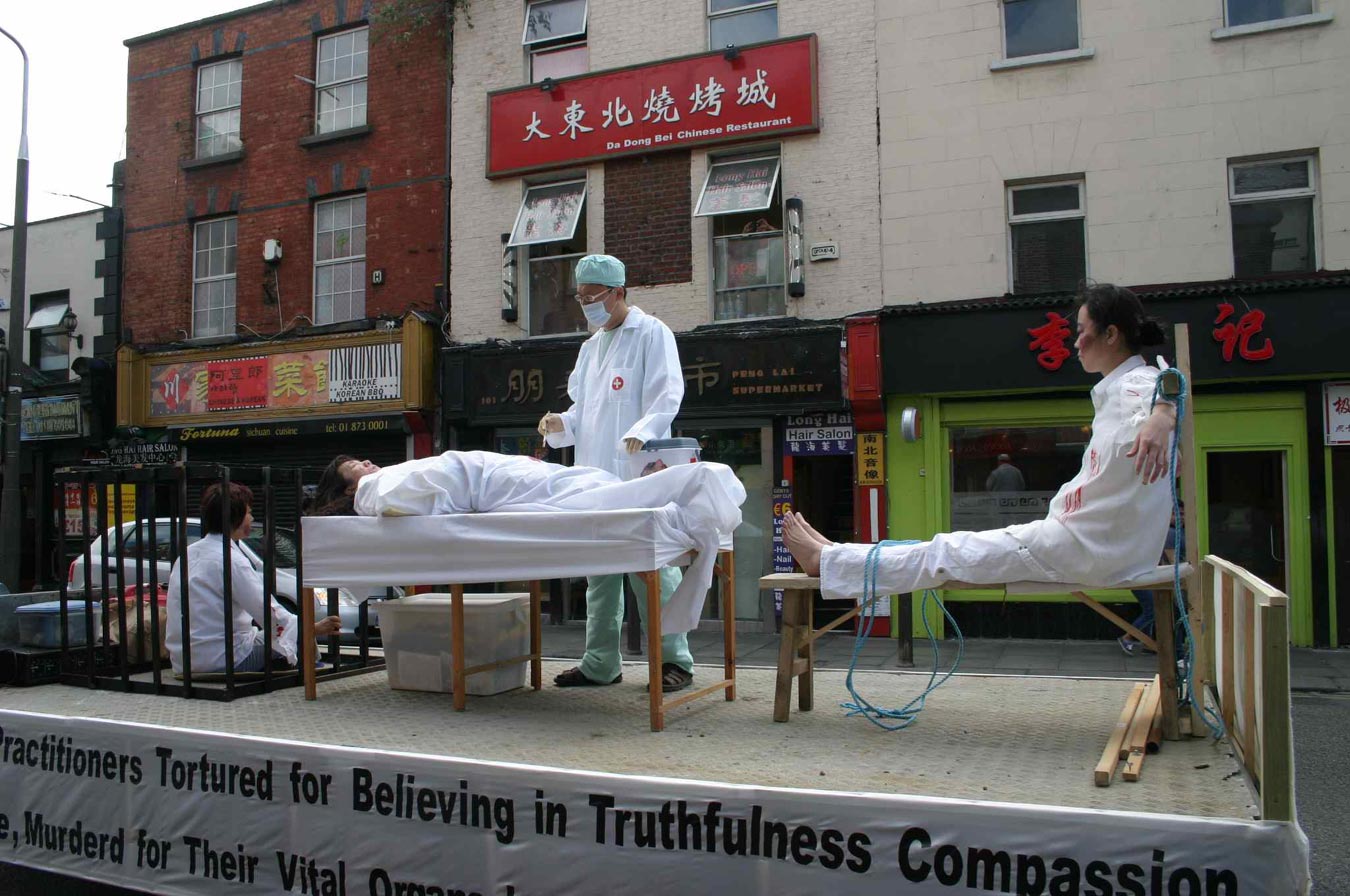 ![]() 游行队伍中的模拟活摘器官酷刑展途经唐人街 |