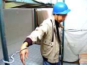 ![]() 酷刑演示:戴着安全帽铐在床架上 |