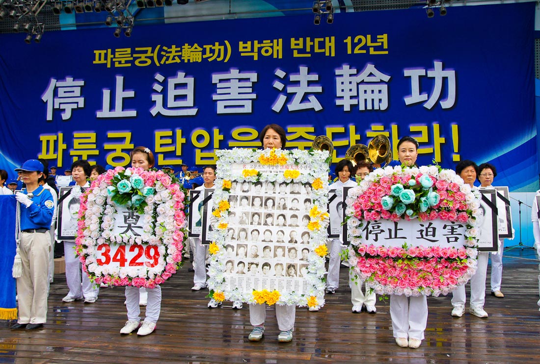 ![]() 二零一一年七月十六日,韩国八大市民团体与法轮功学员冒雨在首尔广场举行联合集会,谴责中共对法轮功长达十二年的人权迫害。图为现场展示被中共迫害致死的中国法轮功学员。 |
