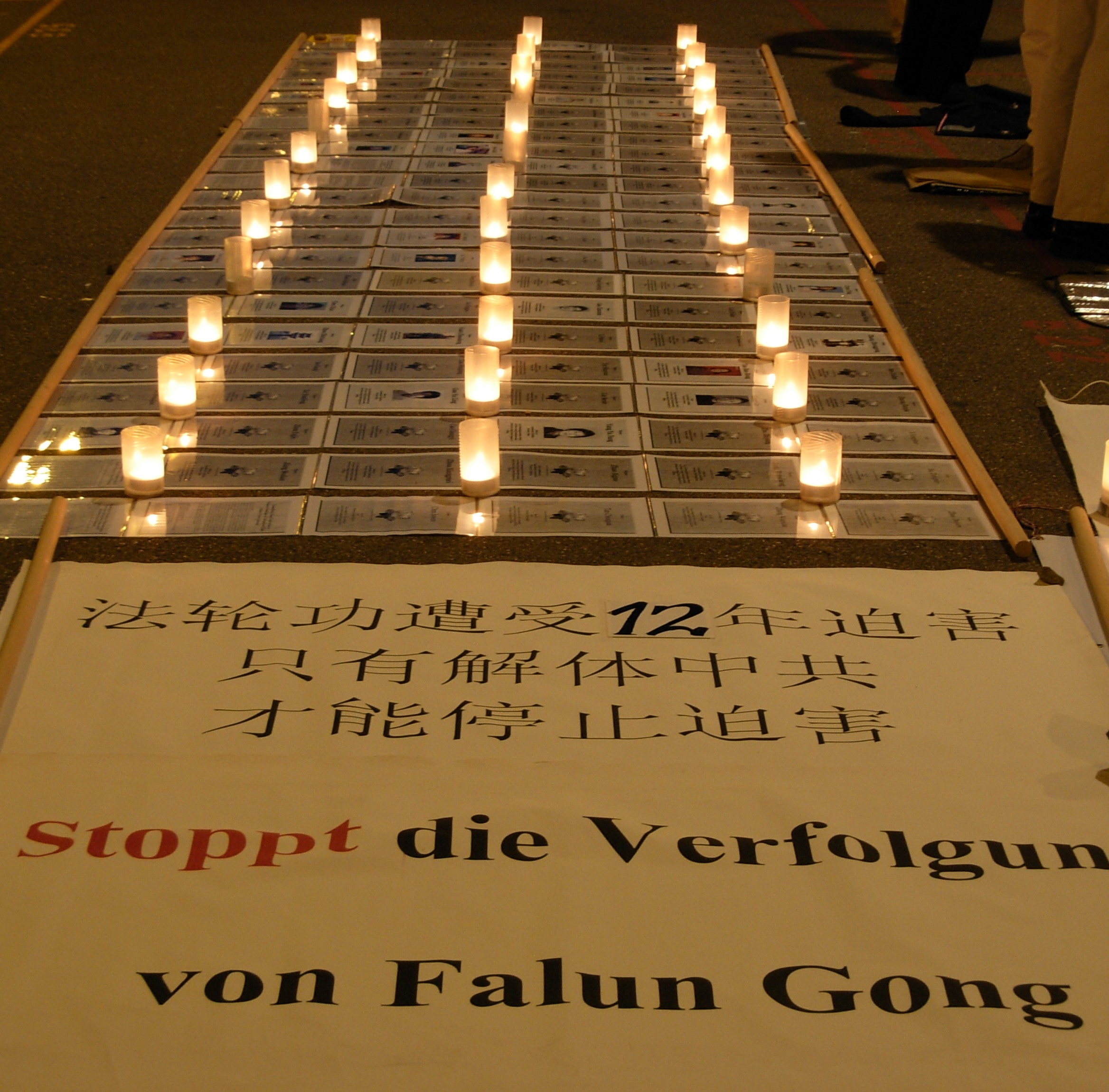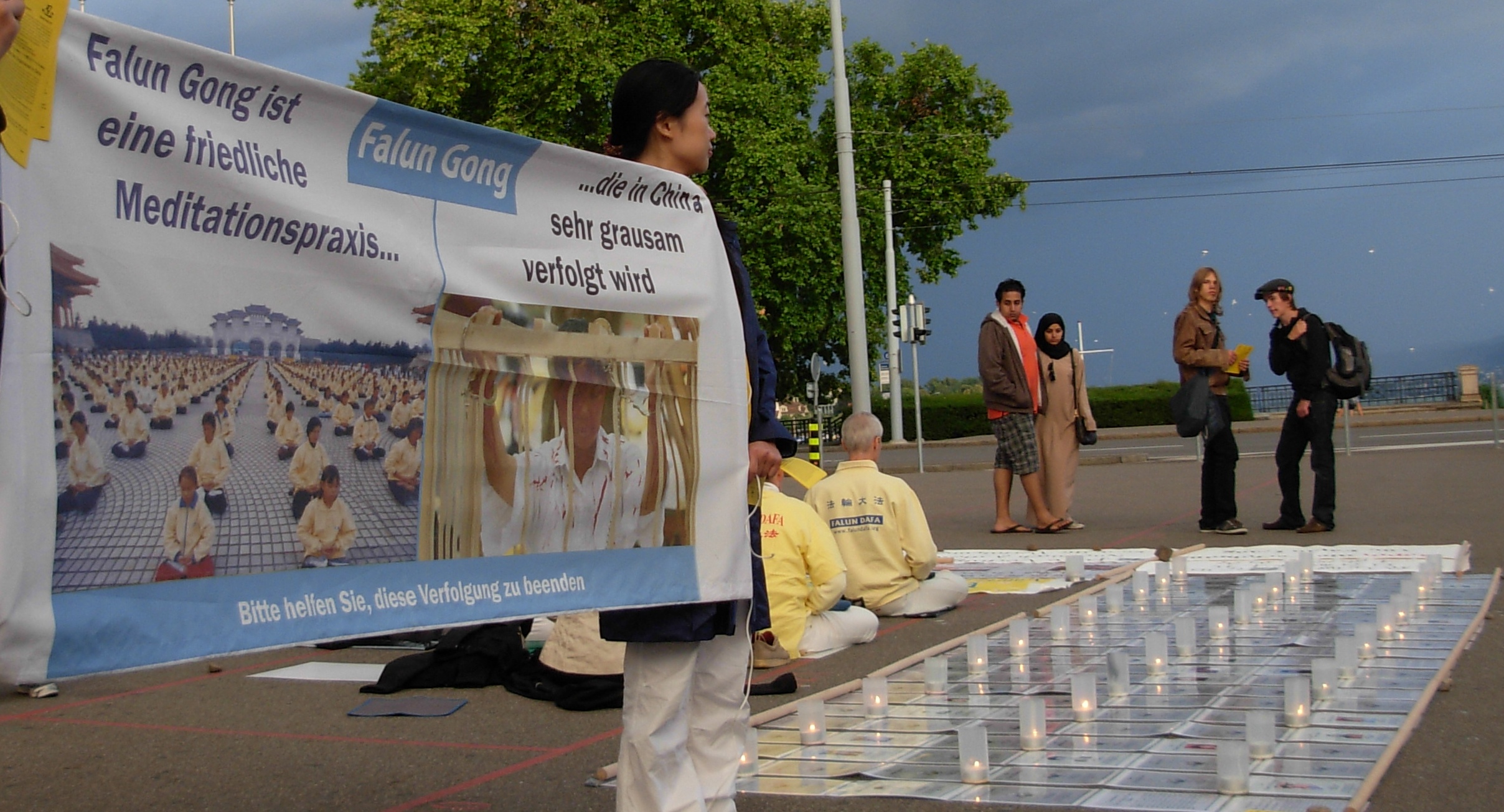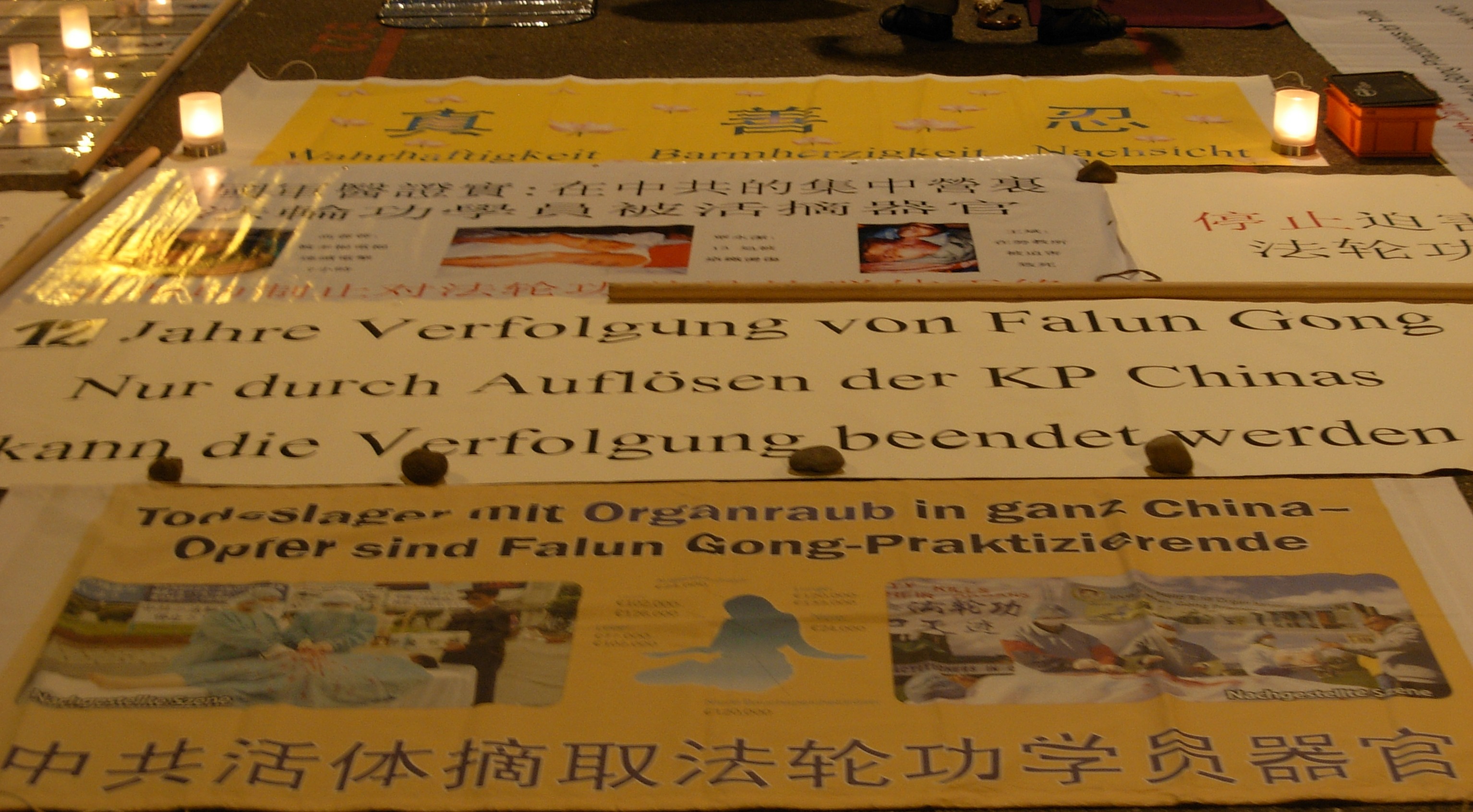 ![]() 横幅和图片,向人们讲述着修炼“真、善、忍”的法轮功学员在中国无辜遭受的迫害 |