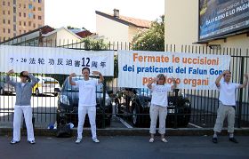 七月二十日上午,法轮功学员们在米兰中领馆前挂起了“法轮大法好”,“7•20法轮功反迫害12周年”和“Fermate le uccisioni dei praticanti del Falun Gong per i loro organi(停止活摘法轮功学员器官)”等横幅,希望更多的海外华人能够了解中共迫害法轮功的真相,选择正义和良知,共同制止中共对法轮功的残酷迫害。