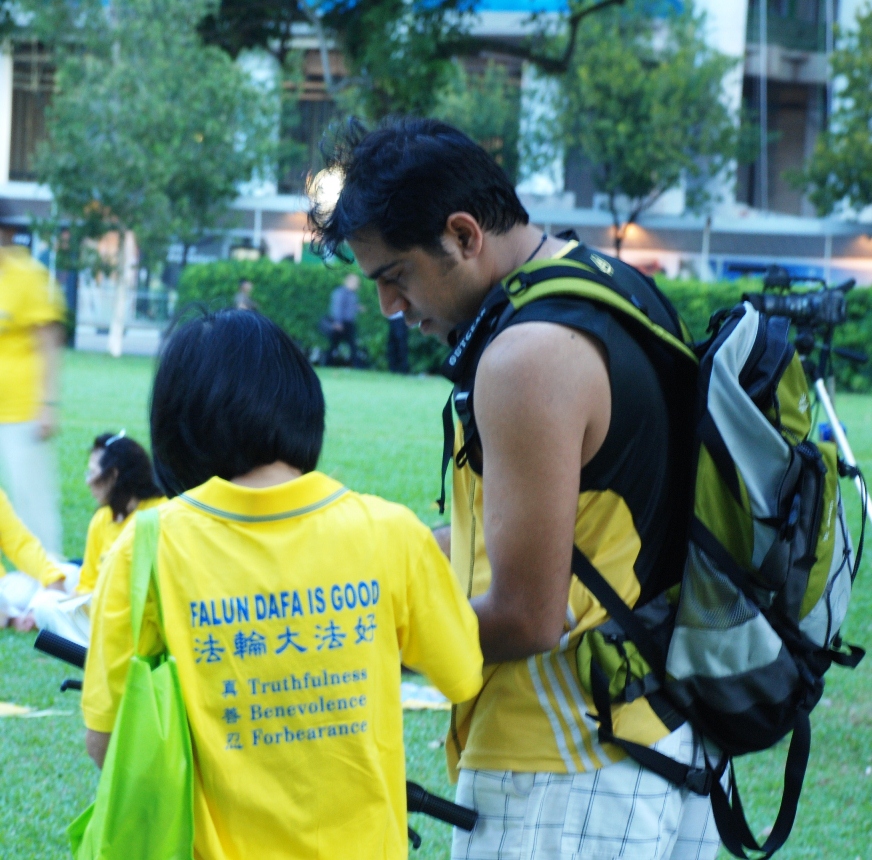 祥和而又庄严的场面吸引了不少路人观看。有的接过学员手中的传单;有的询问法轮功和迫害的详情;有的摄影留念。一位印度裔新加坡人妮巴玛女士说,这是她第一次听说法轮功。当了解到法轮功受迫害的情况后,她表示:“这样的活动很有意义。应该让人们知道这场迫害。现代人都在追求物质上的东西,而这样的场面能够触动人的良知。”