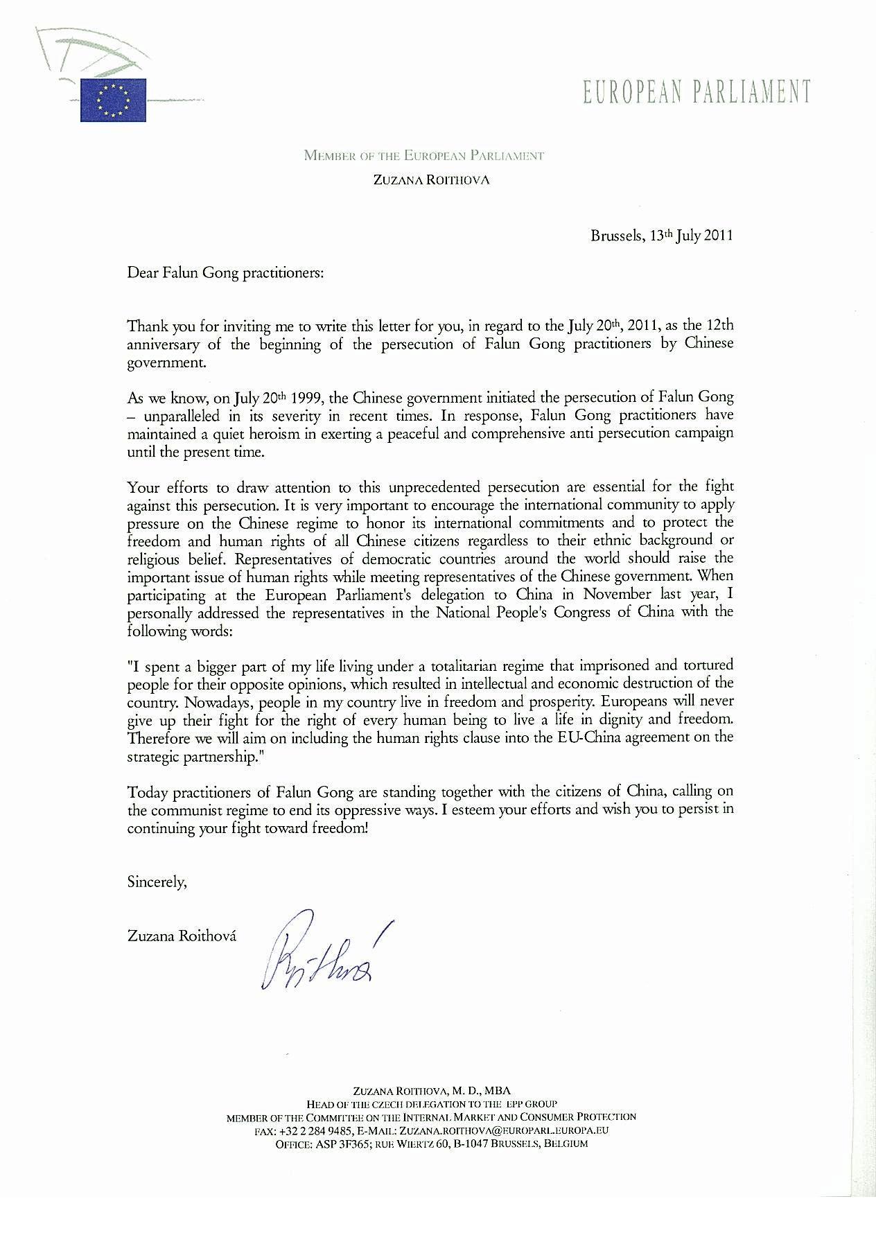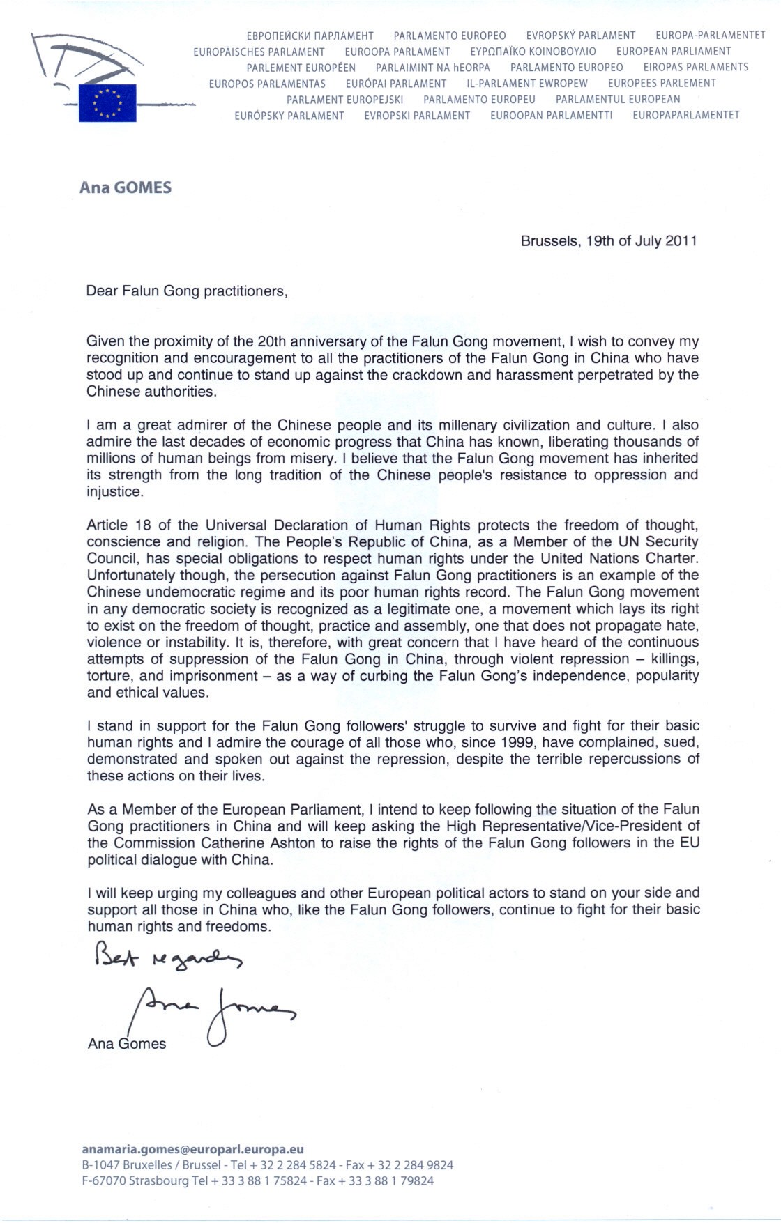 作为欧洲议会议员,我将持续关注中国法轮功学员的情况,并持续要求欧盟委员会副主席兼高级代表凯瑟琳•阿什顿(Catherine Ashton)女士在欧盟与中国的政治对话中提出法轮功修炼者的人权问题。