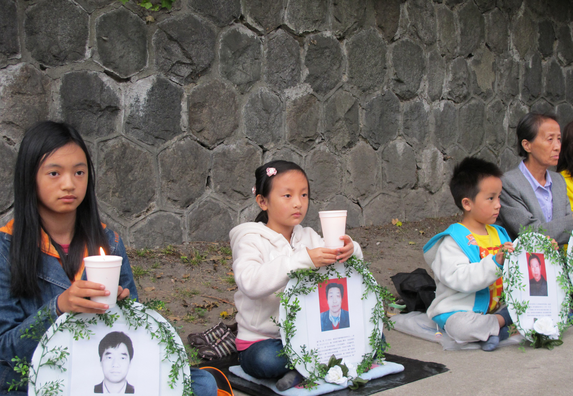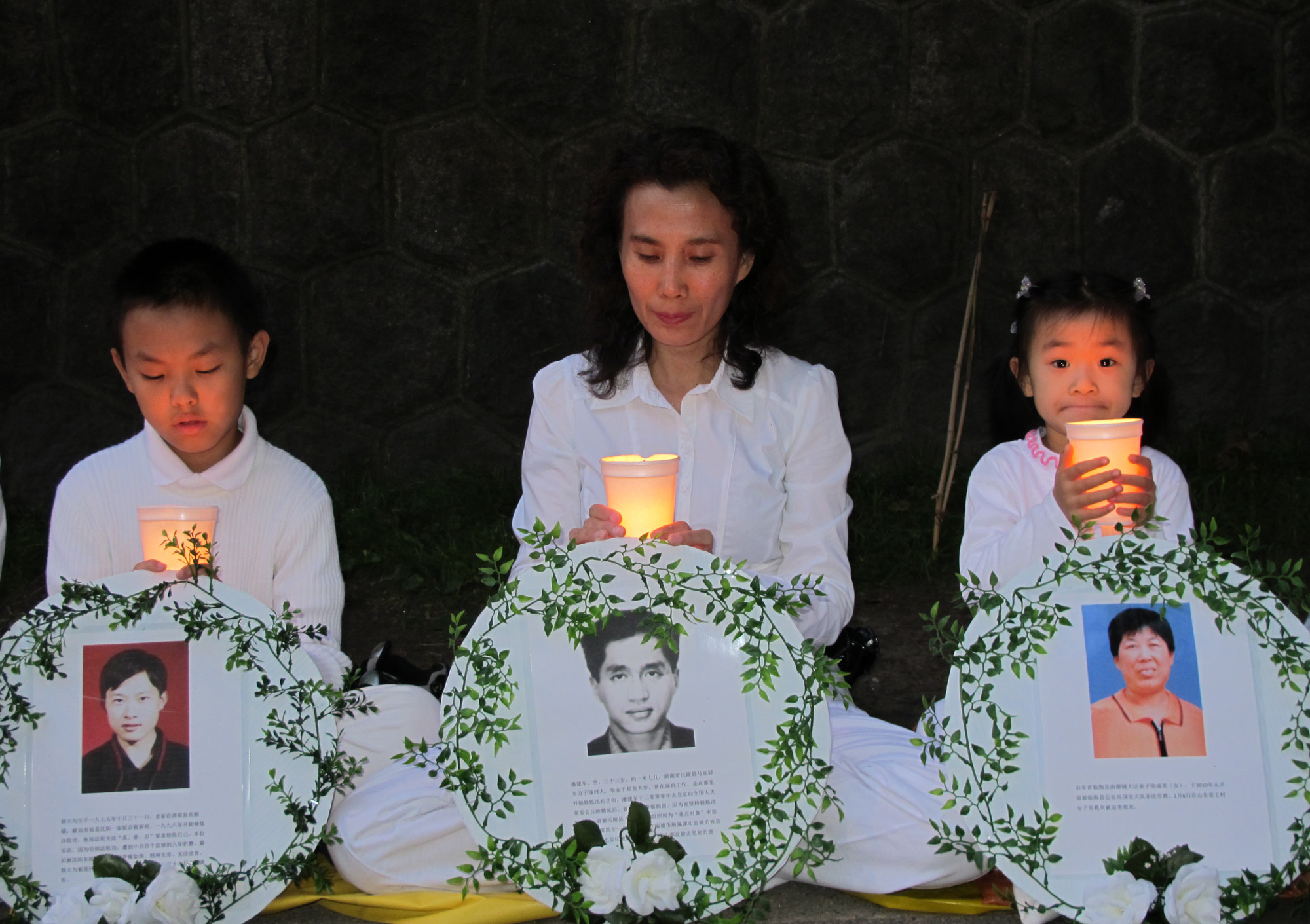 来自北京年过七十的王阿姨和两个小弟子(孙子和孙女)一起默默地坐在悼念的行列里。她还未开口,眼眶就红了,她哽咽着说:“迫害十二年了,天在流泪,人也在流泪。今天在这里悼念,孩子们也坚持一定要来。”想起大陆同修受到的迫害,王阿姨难过得说不下去。