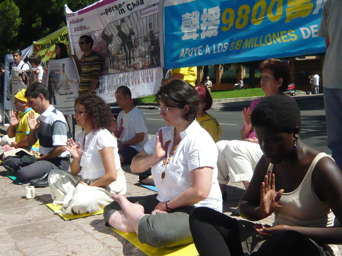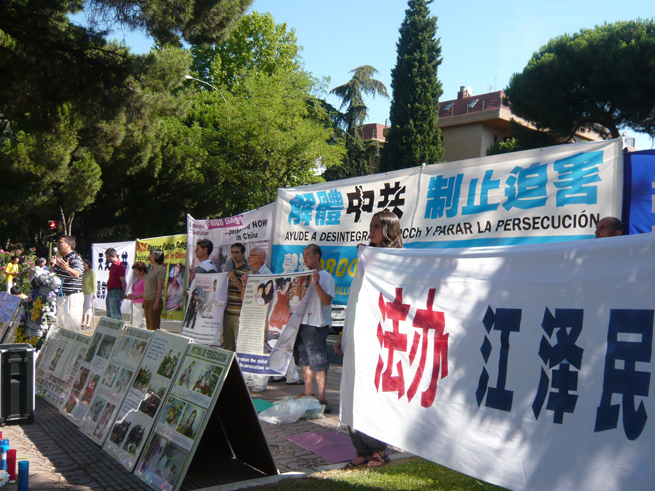 二零一一年七月十六日,西班牙法轮功学员来到中使馆前,揭露中共十二年来对法轮功的迫害,要求惩办迫害元凶, 制止中共的反人类罪行。法轮功学员展开写着“法轮大法好”、“解体中共 制止迫害 ”、“惩办迫害元凶” ,“停止迫害法轮功”等大横幅;活动现场摆放着白色的花环和点燃的蜡烛,悼念为了维护 “真、善、忍”信仰而被中共虐杀的中国大陆法轮功学员。