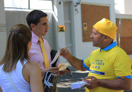 法轮功学员和平抗议的活动吸引了过往民众的目光,并得到他们的热心支持。中使馆所在街区属于富人区,行人不是很多,但几乎所有路过的行人都会停下脚步观看这宁静祥和与肃穆的场面,并签名反迫害。许多经过的车辆放慢车速,司机鸣笛表示支持,或在短暂的红灯停车时接过法轮功学员递上的真相资料。更有好几位开车经过这里的热心的西班牙人特意将车停在路边,走下车在制止迫害的签名簿上签名。