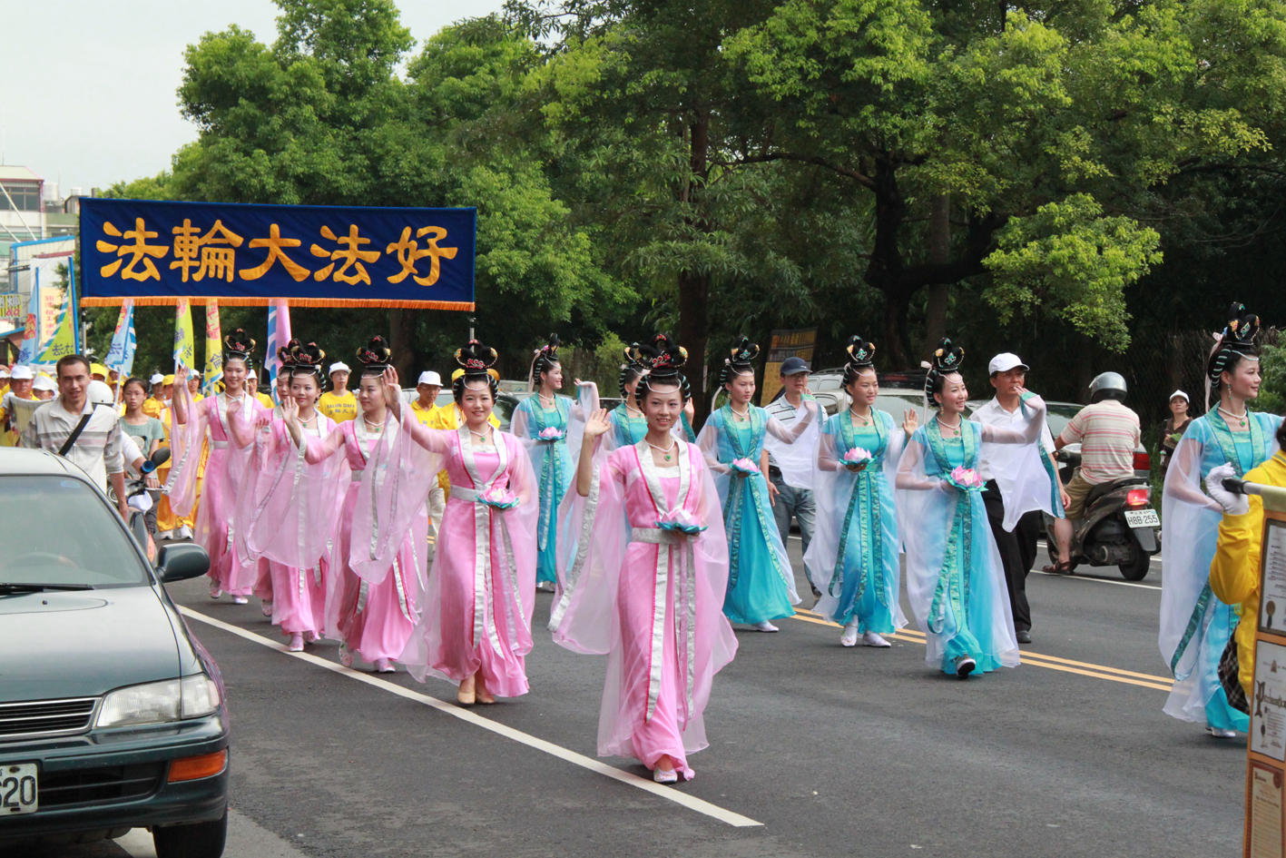 ![]() 腰鼓队参加台糖六十五周年庆祝活动,演示法轮功五套功法 |