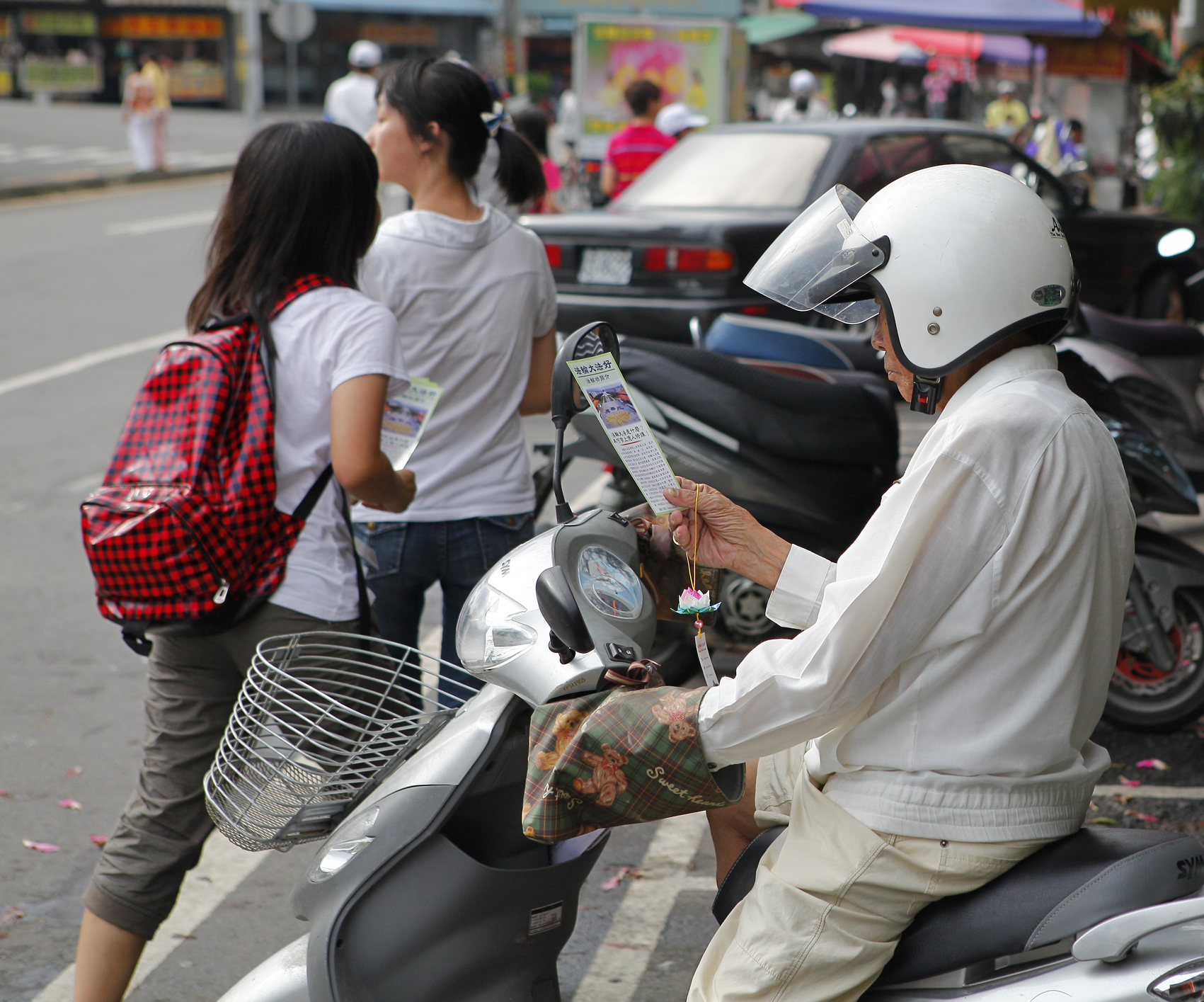 ![]() 冈山区沿途民众欣然接受法轮大法简介资料以及系有“法轮大法好”的纸莲花吊饰 |
