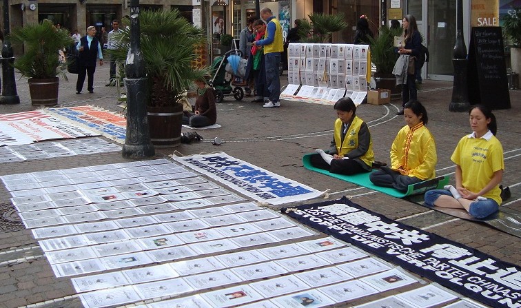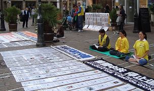 有几位学员在遇害同修的遗像前安详的打坐。人们围过来观看,很多人向学员要传单,主动与学员交谈,急切地询问什么是法轮功,竟然在中国被惨烈迫害十二年?不时有人用相机在拍照,对法轮功表示同情和支持。有人也坐在了法轮功学员旁边,表示支持。