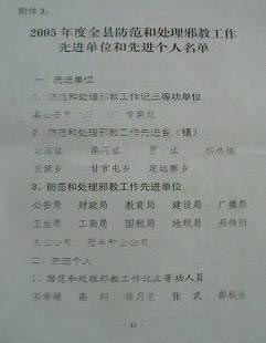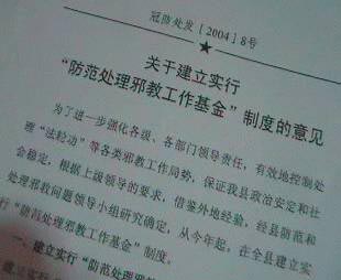 为了加强迫害,冠防处发【2004】8号文件(据鲁“六一零”办发【2003】33号文件《关于涉法轮功问题有关具体政策的意见》),内容是为了迫害法轮功,建立实行“防范处理×教工作基金”制度,要全县给它送钱,赏举报和迫害“有功”人员。法轮功是教人向善的正法,中共才是害人的邪教。