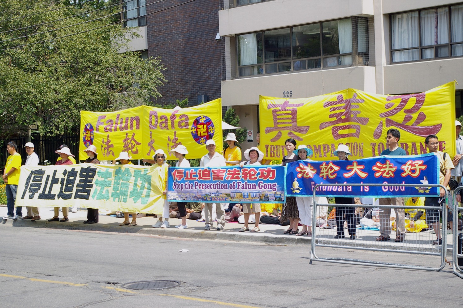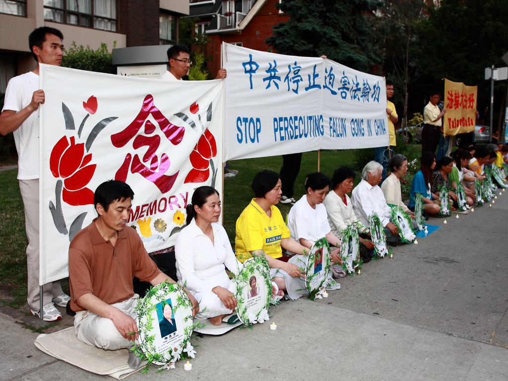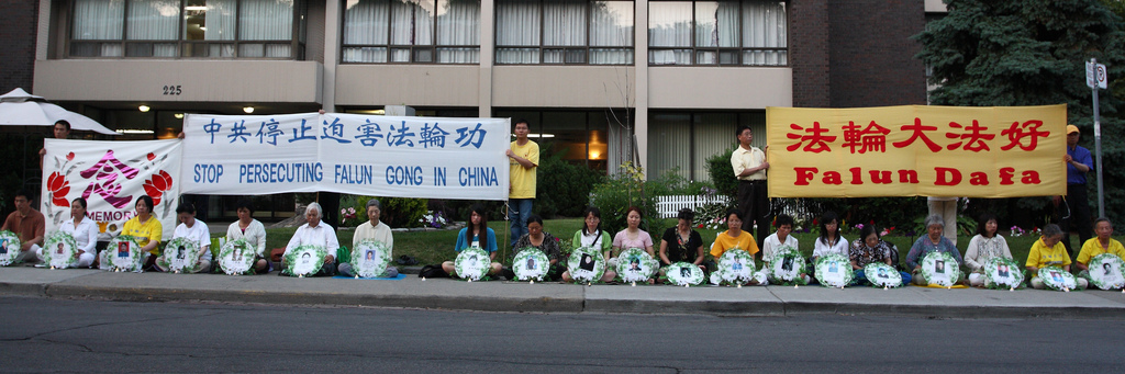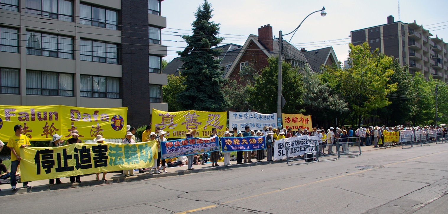 七月二十日,在多伦多市政府酷热警告下,一百多名法轮功学员在中领馆前集会,呼吁制止迫害。集会从中午十一点五十五分开始,数名在中国大陆受到过酷刑折磨的法轮功学员,以亲身经历揭露了中共迫害的残酷。之后法轮功学员到街头讲真相,傍晚时分,法轮功学员点燃了烛光,手捧花圈,悼念在中国大陆被迫害致死的同修,场面庄严肃穆。