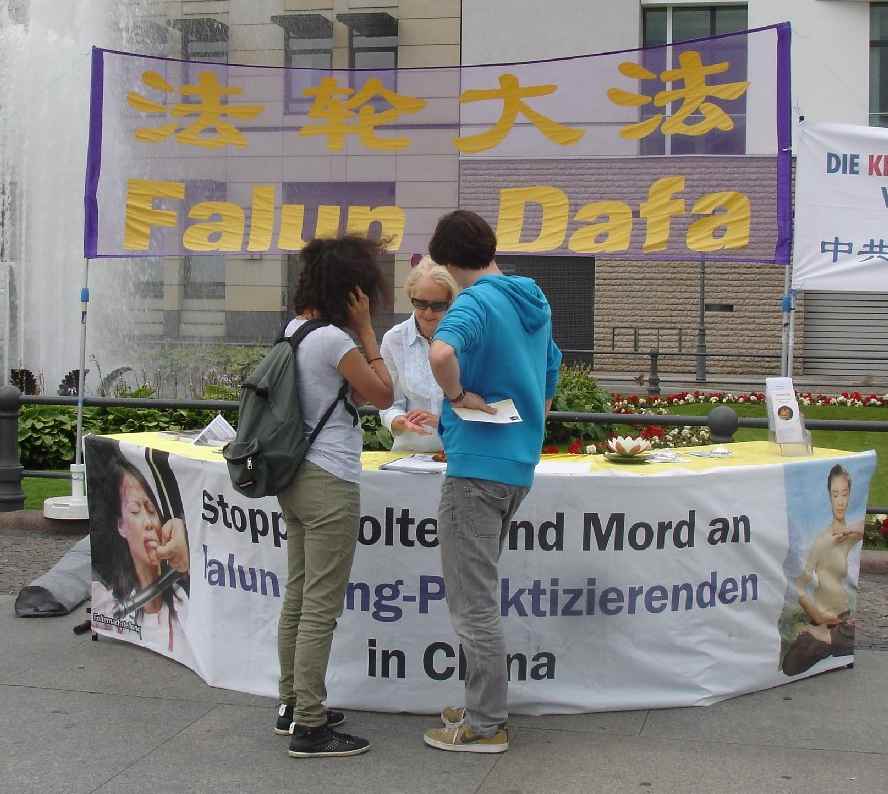 一位刚从中国来德国探望儿子的中年妇女也来到了摊位上。她表示,在中国时她没有接触过法轮功,只是听到了中共的一面之词,但是她知道,中共的话是不能相信的,她的家人就有不少在以前受到过中共的迫害,中共总是把是非颠倒过来。这次在柏林看到法轮功的摊位,她很高兴能了解一下情况,并把一些资料带回去细看。