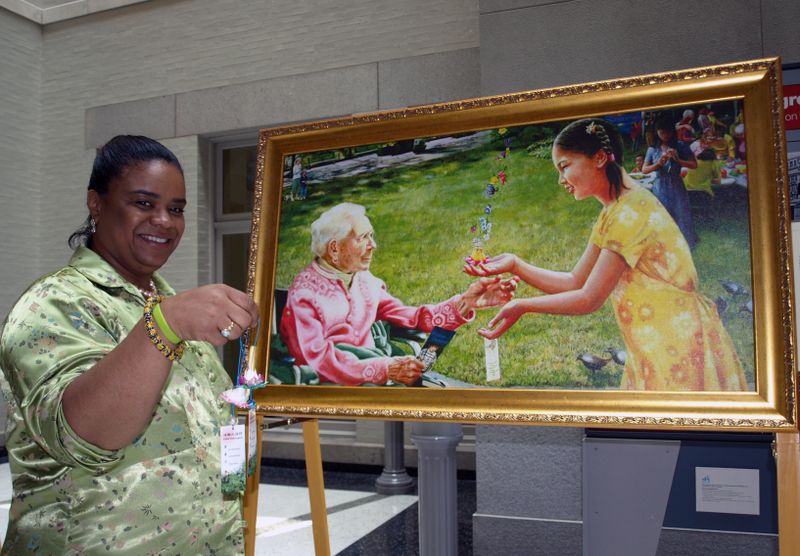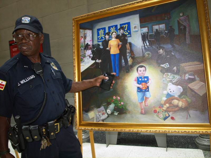 曾在美国国会工作、现在华盛顿DC市长办公室负责对外联络的多瑞达(Dorinda)被画作《纯真的呼唤》打动。 画中的小女孩举着横幅在雨中久久站立。多瑞达说:“那个小女孩引起了我的注意,这幅画告诉人们发生在中国的对法轮功的迫害。 很有教育意义。”