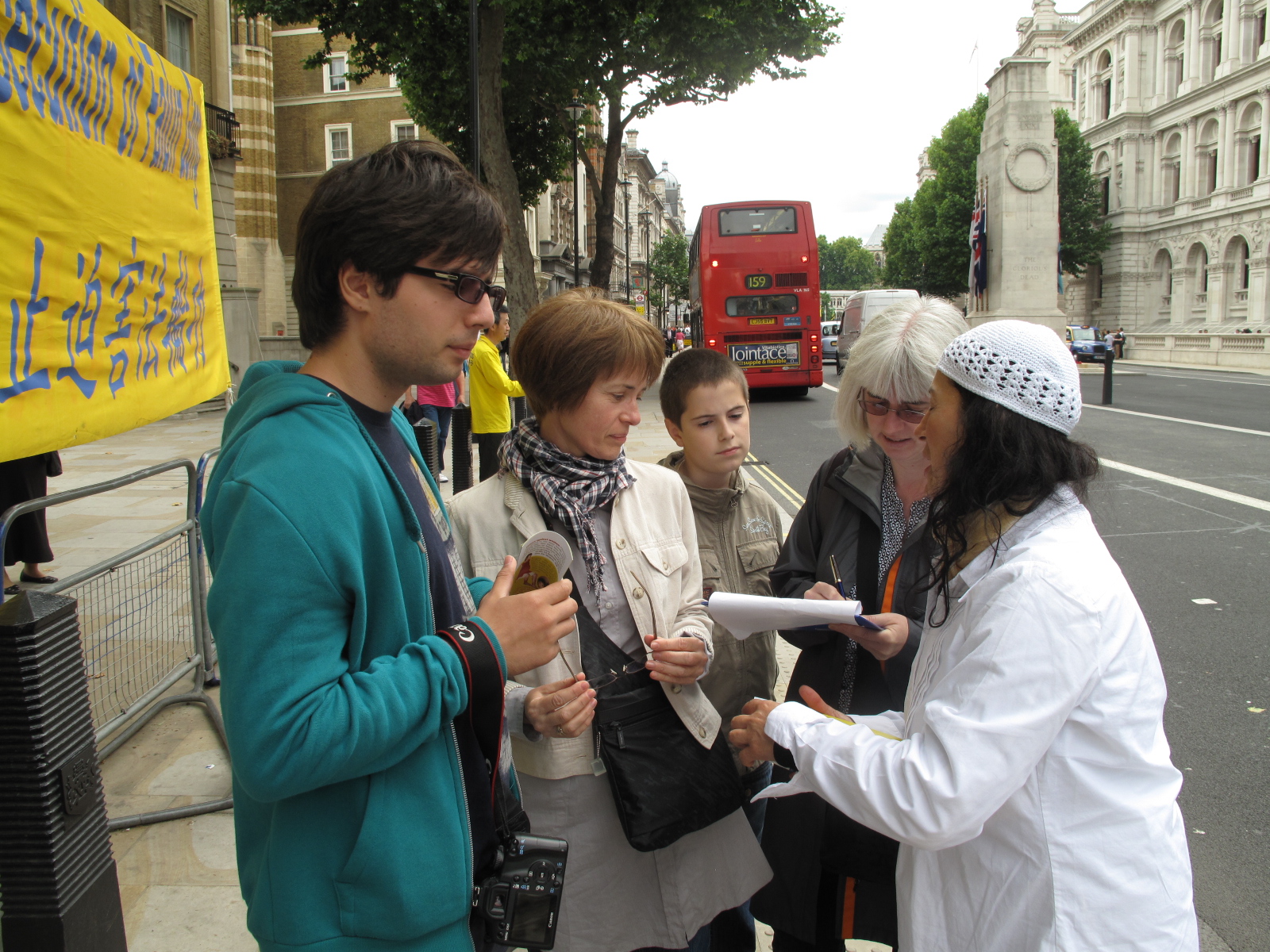 ![]() 唐宁街上人们驻足了解真相并签名反迫害 |