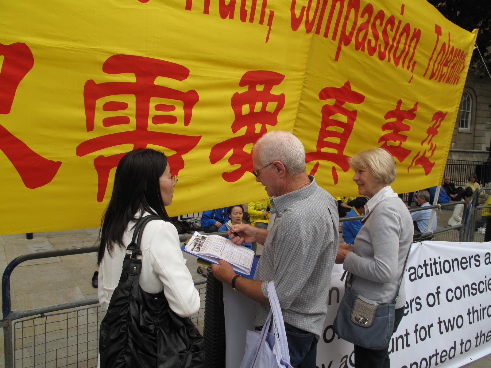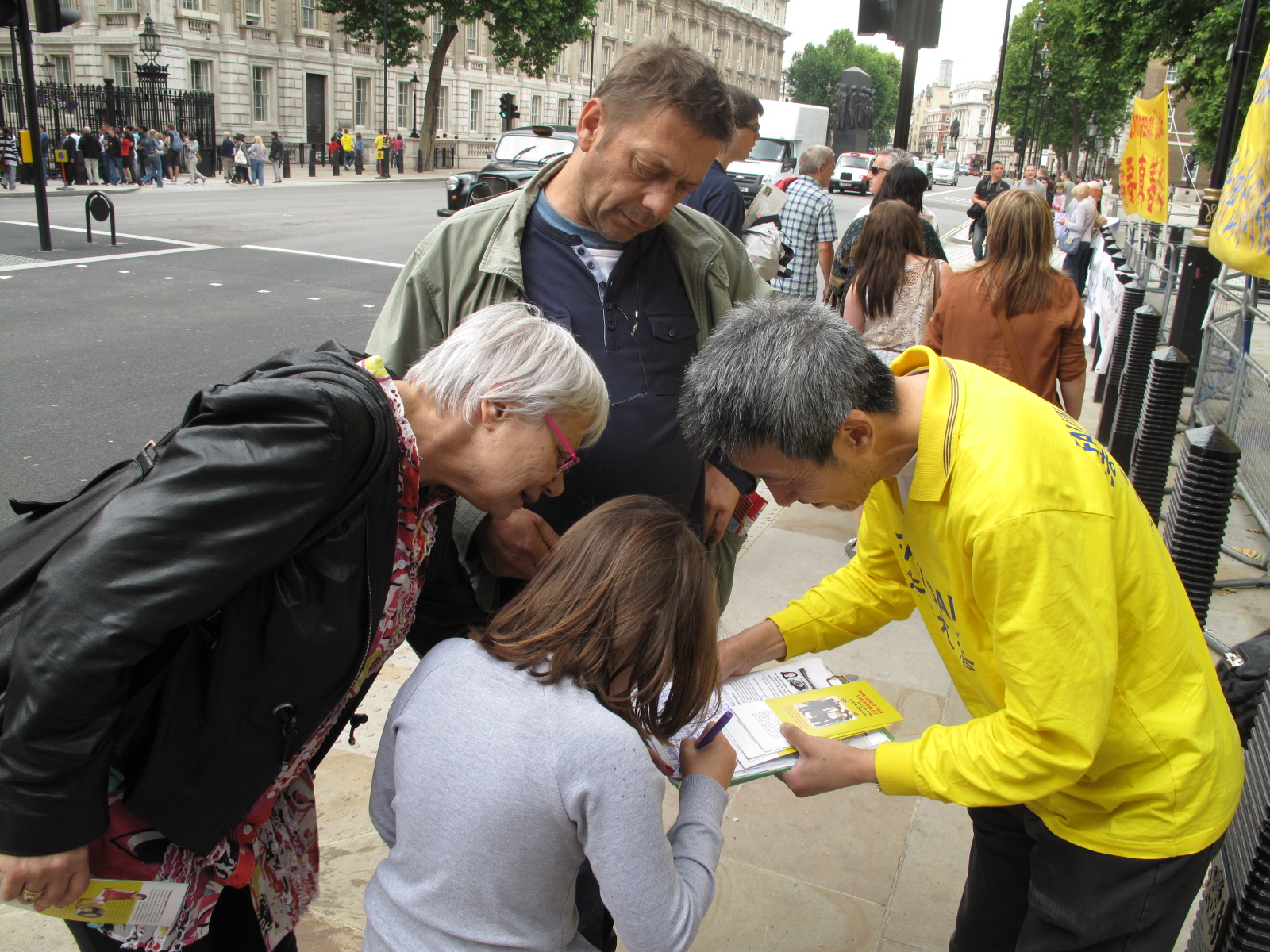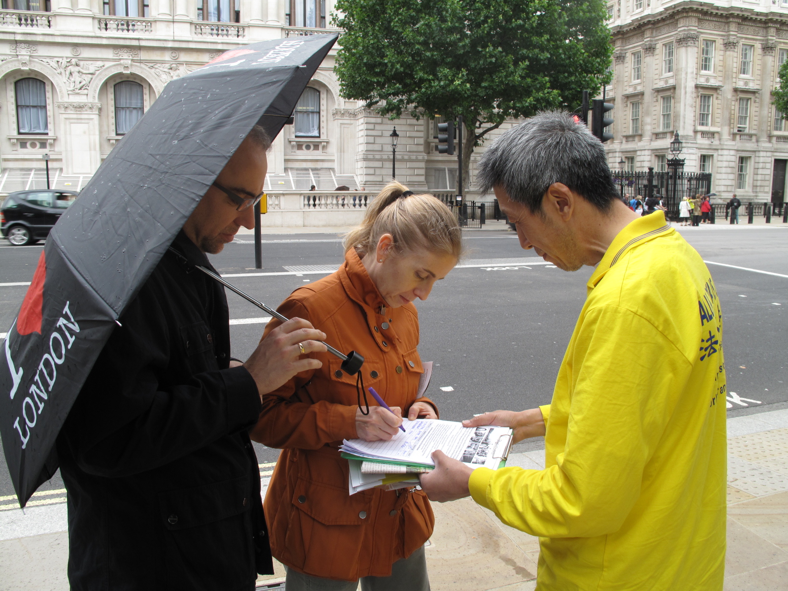 近两万个来自英国各地的请愿签名被送进了首相府,而在当天递信之后,法轮功学员在首相府外的唐宁街上又征集了几百个签名。在唐宁街上经过的人中,有很多来自世界各个国家的游客,经常可以看到中国人的面孔,特别是一群群来英国集体旅游的学生。还有不少在议会或政府部门工作的政要或普通员工。他们很多人是第一次听说法轮功真相,但他们在简单了解真相后就毫不犹豫地在征签表上签字。也有一些是以前听说过法轮功真相的,他们当中的一些人走过来从法轮功学员手里接过征签表就签上自己的名字。另外,在唐宁街上行驶而过的汽车司机中有一些人在路过法轮功学员的活动场地时鸣笛表示支持。