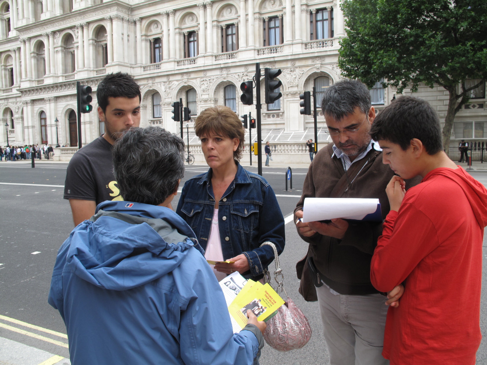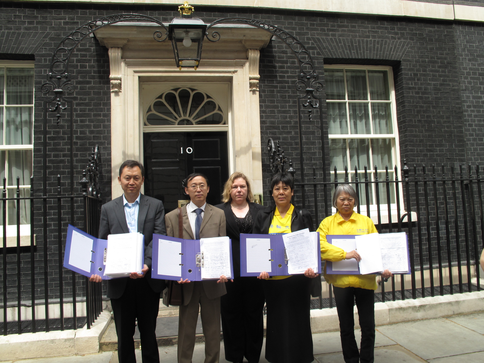 ![]() 法轮功学员在唐宁街10号门前展示即将递交的反迫害请愿签名表 |