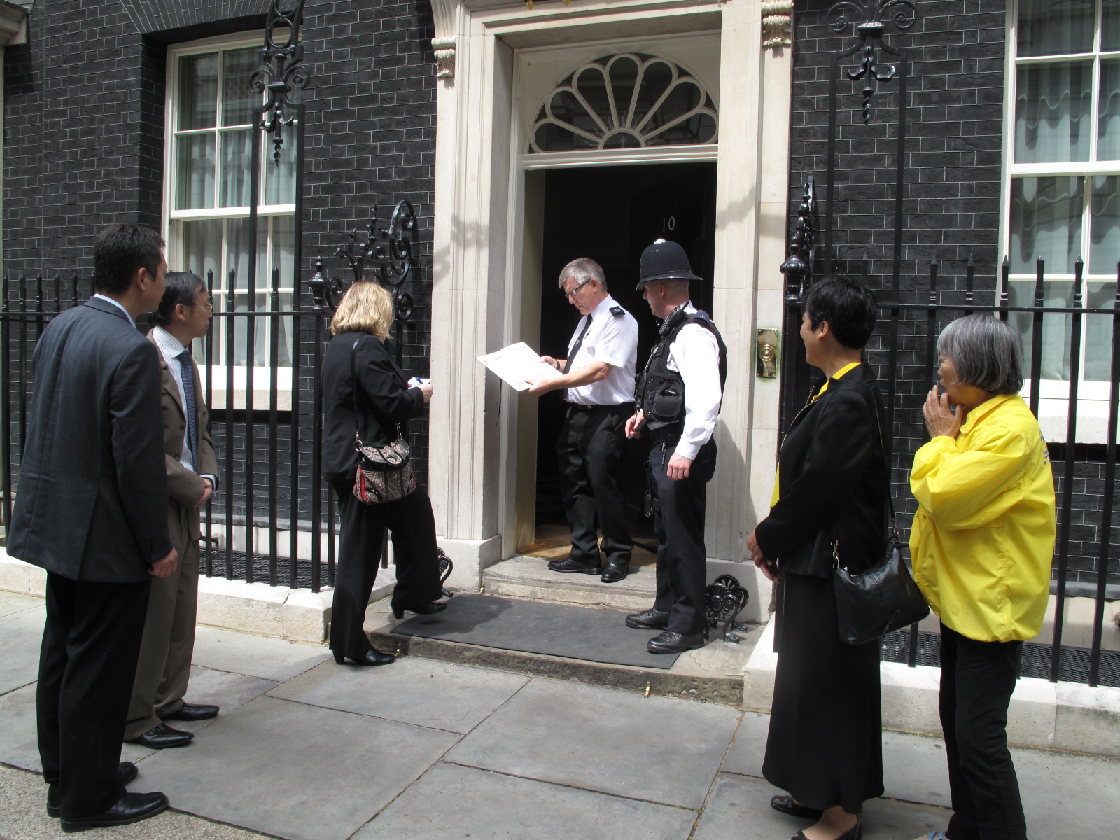 下午一点半左右,五位法轮功学员来到唐宁街十号门前,把这一年来法轮功学员在英国各地所征集的近两万个反迫害请愿签名递交首相府,要让英国政要看到、听到广大民众支持法轮功反迫害的良知和正义呼声。首相府工作人员代表首相接受了厚厚的四本请愿签名表。
